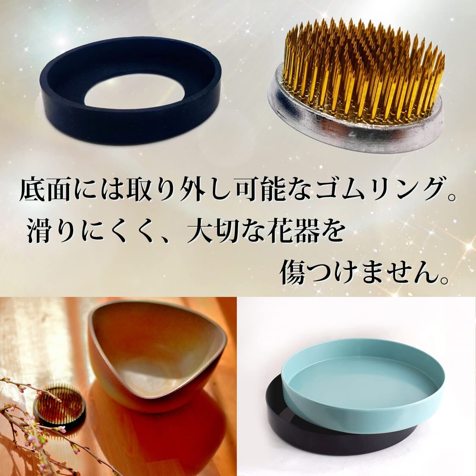 【ぴたっと固定】滑り止めゴムリングを備えたこの剣山は、安定感抜群で花器に優しい設計。ゴムリングが底面にしっかりと接触し、滑りにくく安定した生け花を実現。花器を傷つける心配もなく、あらゆるシーンで美しい生け花を楽しむことができます。