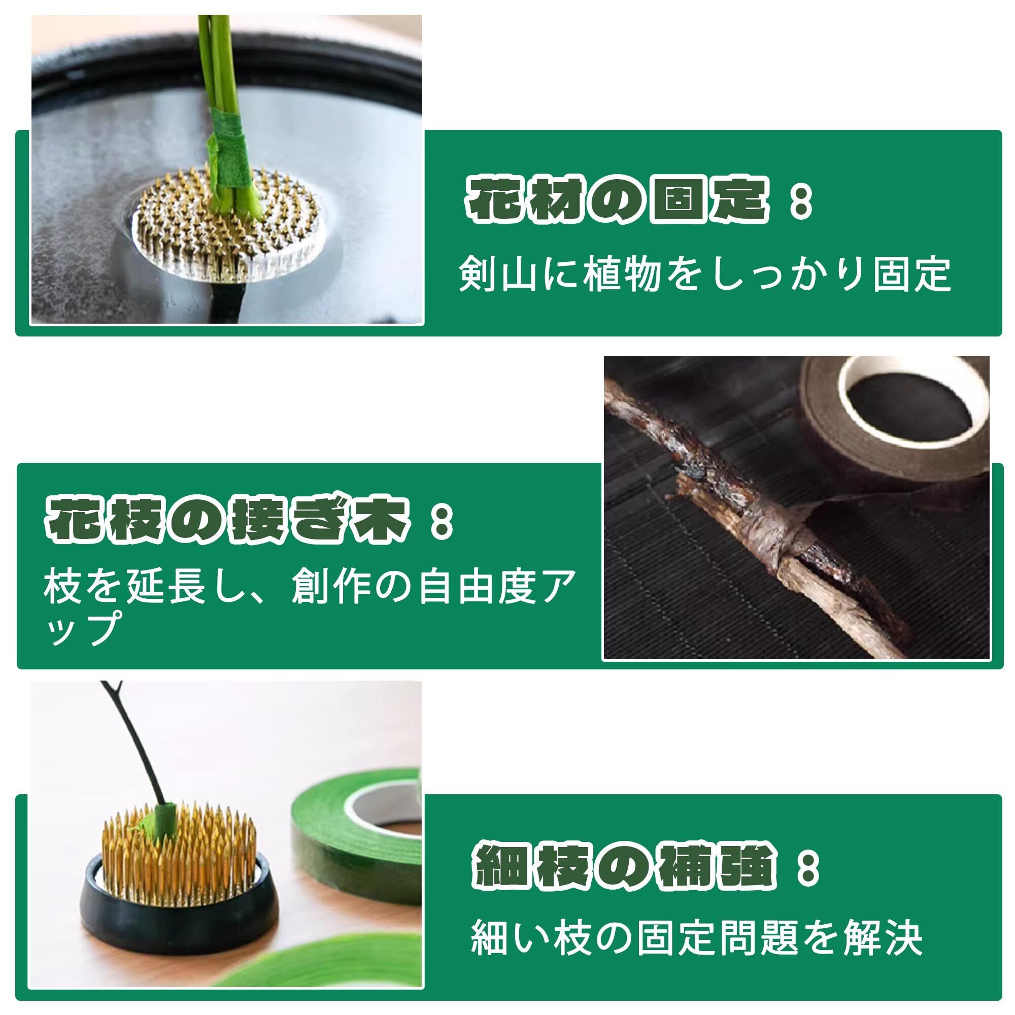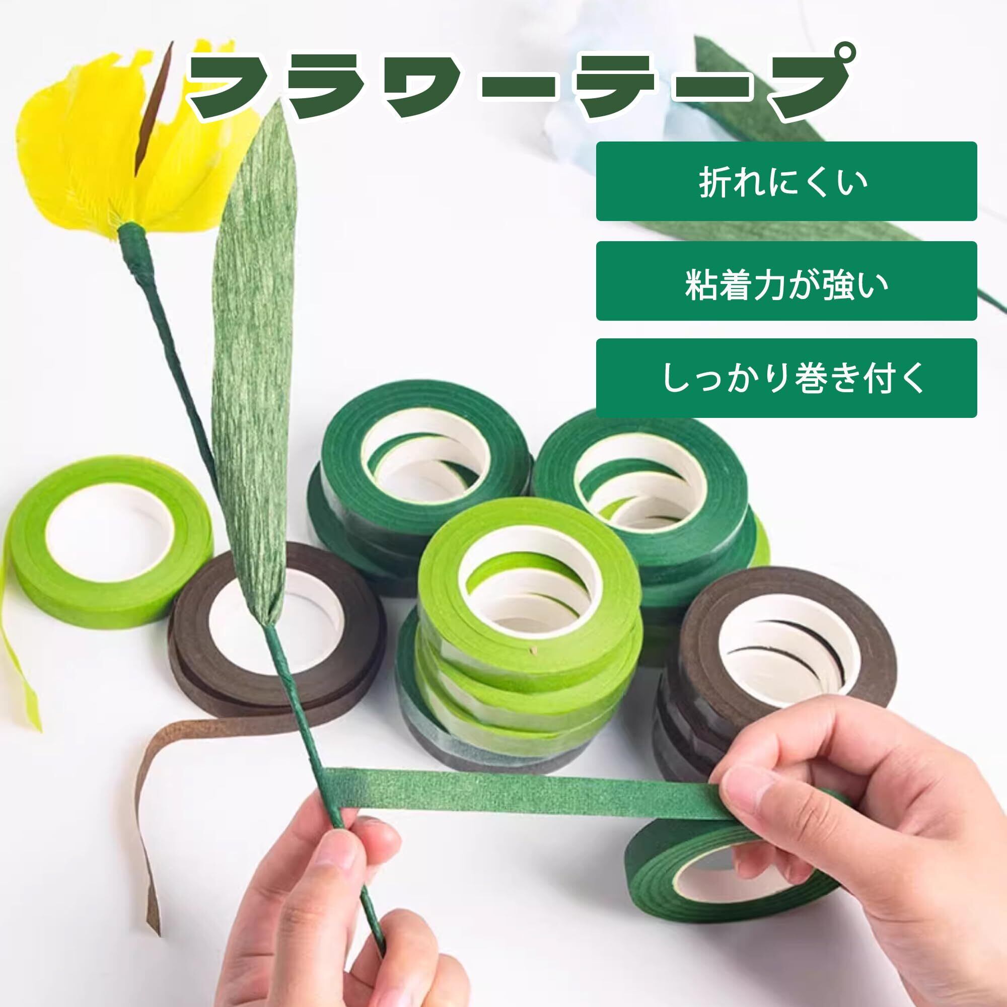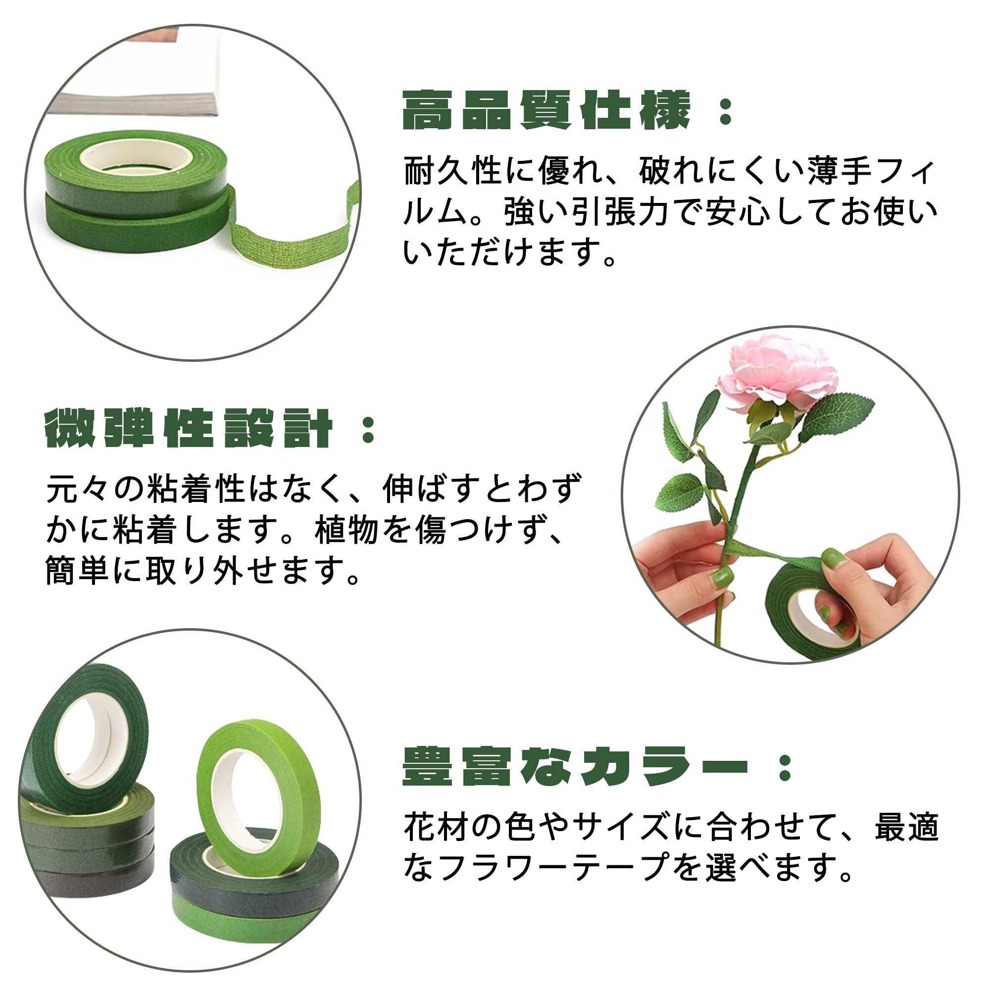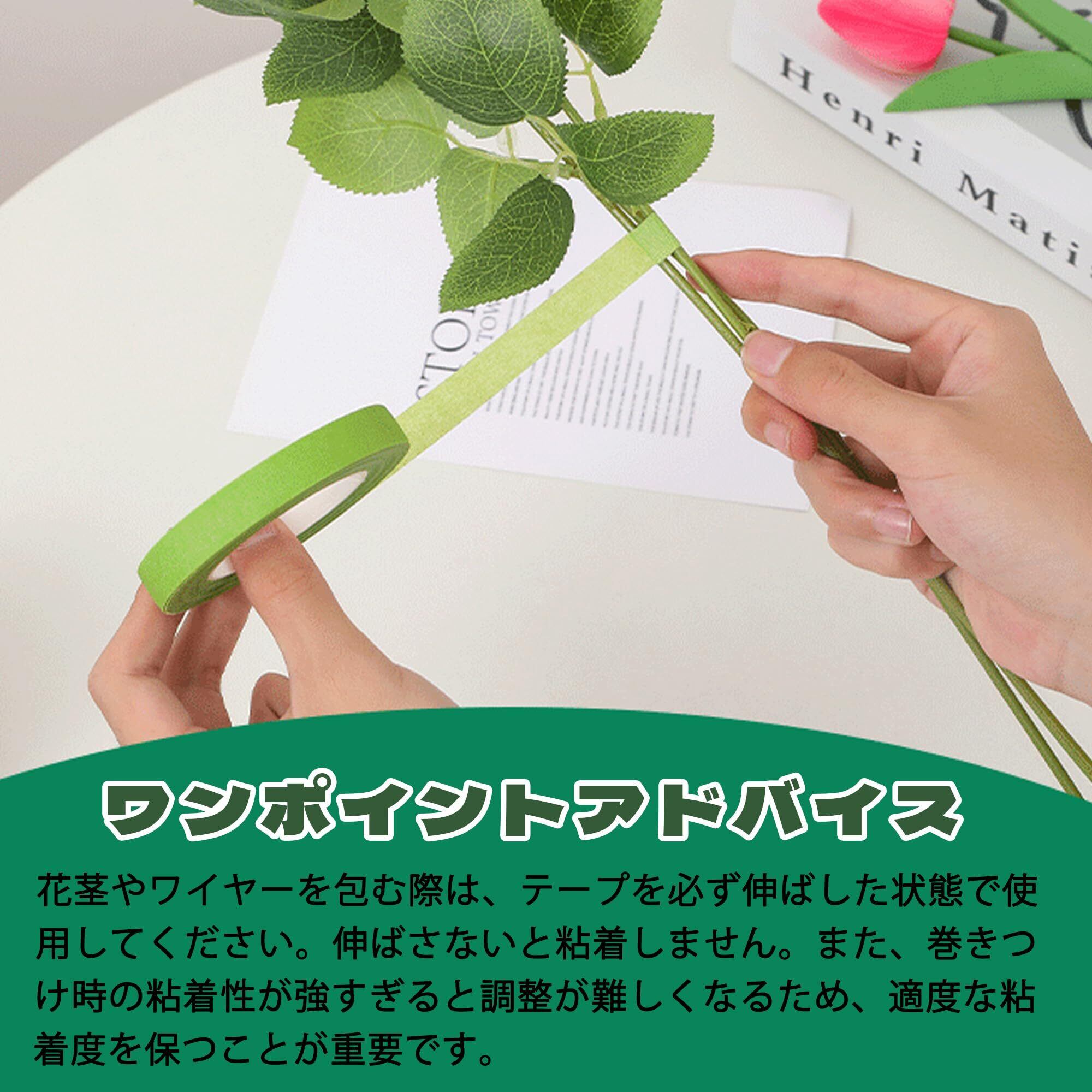【幅広い用途】フローラルテープ 緑はアレンジメント、人工花、クリスマスデコレーション、家庭DIYなどに適しています。鉄線、花茎、LEDライトラインを巻き付けられ、金属線をカバーしてリアル感を高めます。フラワーアート制作、ギフト包装、工芸品デザインに理想的な補助材料です。