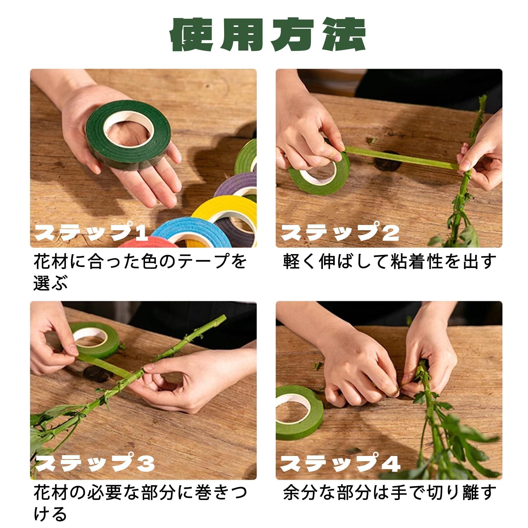 【簡単操作】フローラルテープは3ステップで巻き付けが完了します:カラーを選択→引き伸ばして巻く→端を折って固定。生花/人工花束、ギフト包装、結婚式装飾、DIYライト装飾、花茎の巻き付けなどに広く使用でき、鉄線を隠しながら美観を向上させます。