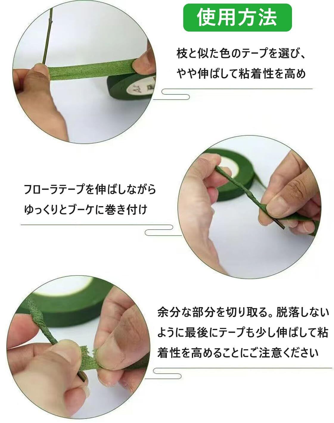 【使用方法】まず、枝と似た色のテープを選び、やや伸ばして粘着性を高め。そして、テープを伸ばしながらゆっくりとブーケに巻き付け。最後に、余分な部分を切り取る(脱落しないように最後にテープも少し伸ばして粘着性を高めることにご注意ください)。