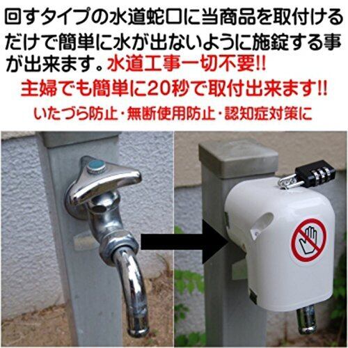 水道蛇口をそのままに加工せず止水できる水道蛇口ロック(取手を回すタイプ)3桁ダイヤル錠付き 今ある蛇口に当商品を付けるだけで水が出ないようにロックできます。(取手を回すタイプ用)南京錠付き 以前は水が出ないようにするには蛇口を付け替える工事が必要でしたが、当商品では蛇口そのままに設置するだけでOKです。 〇家庭の水道蛇口に〇認知症対策・イタズラ防止に 〇公共施設での水道蛇口に〇水道蛇口の管理に・勝手使用の防止に 〇学校での水道蛇口に〇学童のイタズラ防止に・夜間など時間外の使用抑制に 〇飲食店・各種お店に〇店内の使用禁止水道蛇口に・時間外の管理に 〇研究施設・工場など〇管理が必要な蛇口に・使用不可蛇口に目印として 対応できる蛇口 取手を回すタイプ 自社制作の日本製です。