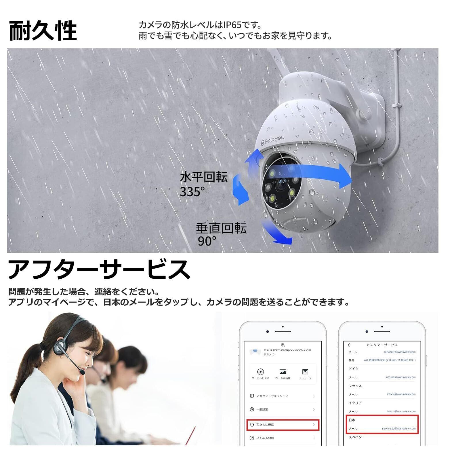 【IP65防水・サポートサービスあり】カメラの防水防塵レベルはIP65で、悪天候でも使用できる。クイック取扱説明書付き。詳しい説明はホームページやアプリで確認できる。