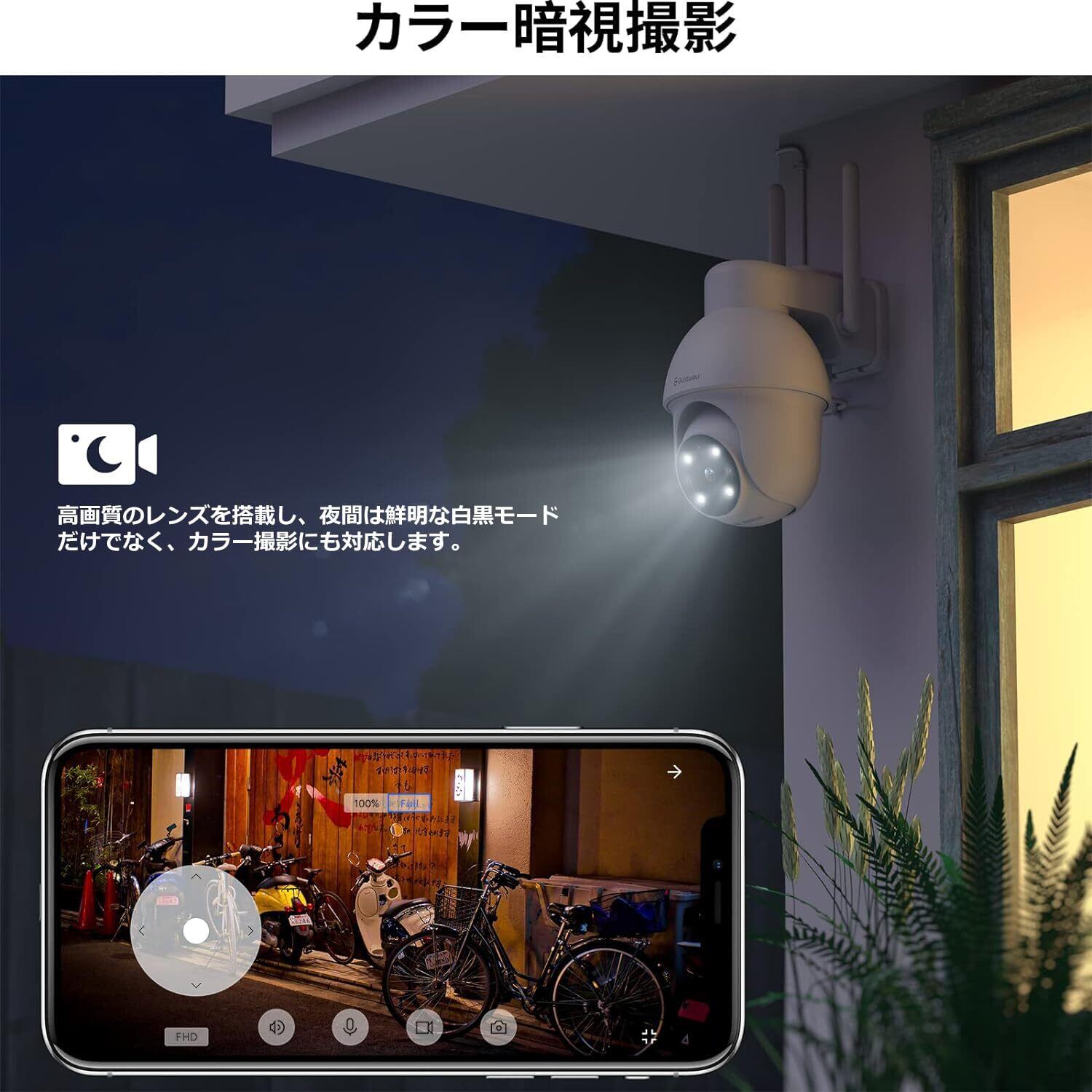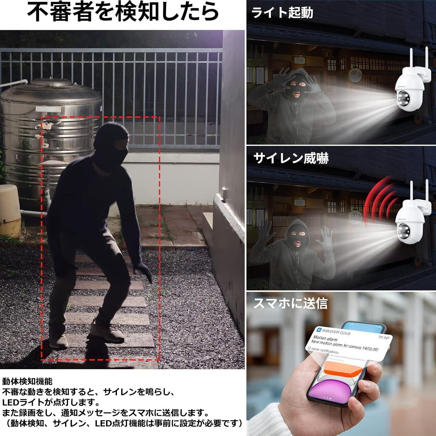 【遠隔操作・動体検知】水平335度、垂直90度回転、広角撮影ができるカメラ。設置後は外出先でもスマホで操作できる。店舗や倉庫、駐車場の遠隔監視用カメラとしても使える。屋外カメラは動きを検知すると、メッセージを即座に送信。重要な瞬間を見逃さない。