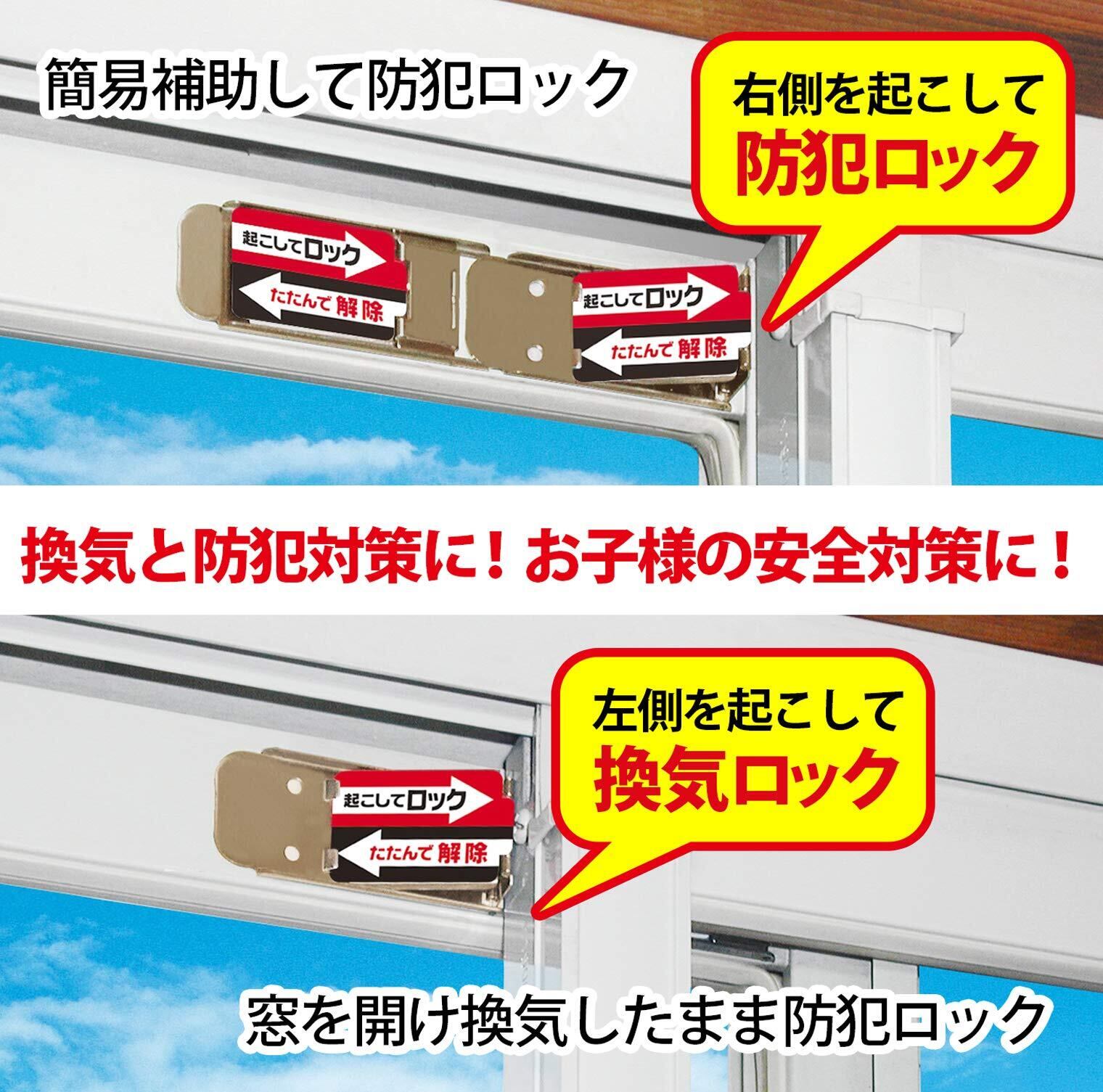 サッシ枠に取り付けて、補助的に窓をロック。 取り付け位置によって開閉位置の調整が可能。 横に2個並べて使えば、「窓を閉じた状態」「少し開いた換気状態」の2通りでロックできます。 サッシのクレセント錠との併用で防犯効果アップ。 もちろん、単品で4箇所の簡易補助錠としても使用できます。 網戸にも取り付けられるので、お子さまの安全対策にも効果的。 素材・材質:ステンレス、粘着テープ 生産国:タイ ●取付可能寸法=クレセント錠を開錠した状態で、外側・内側サッシ枠の間4mm以上の隙間が必要です。