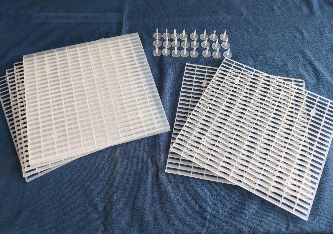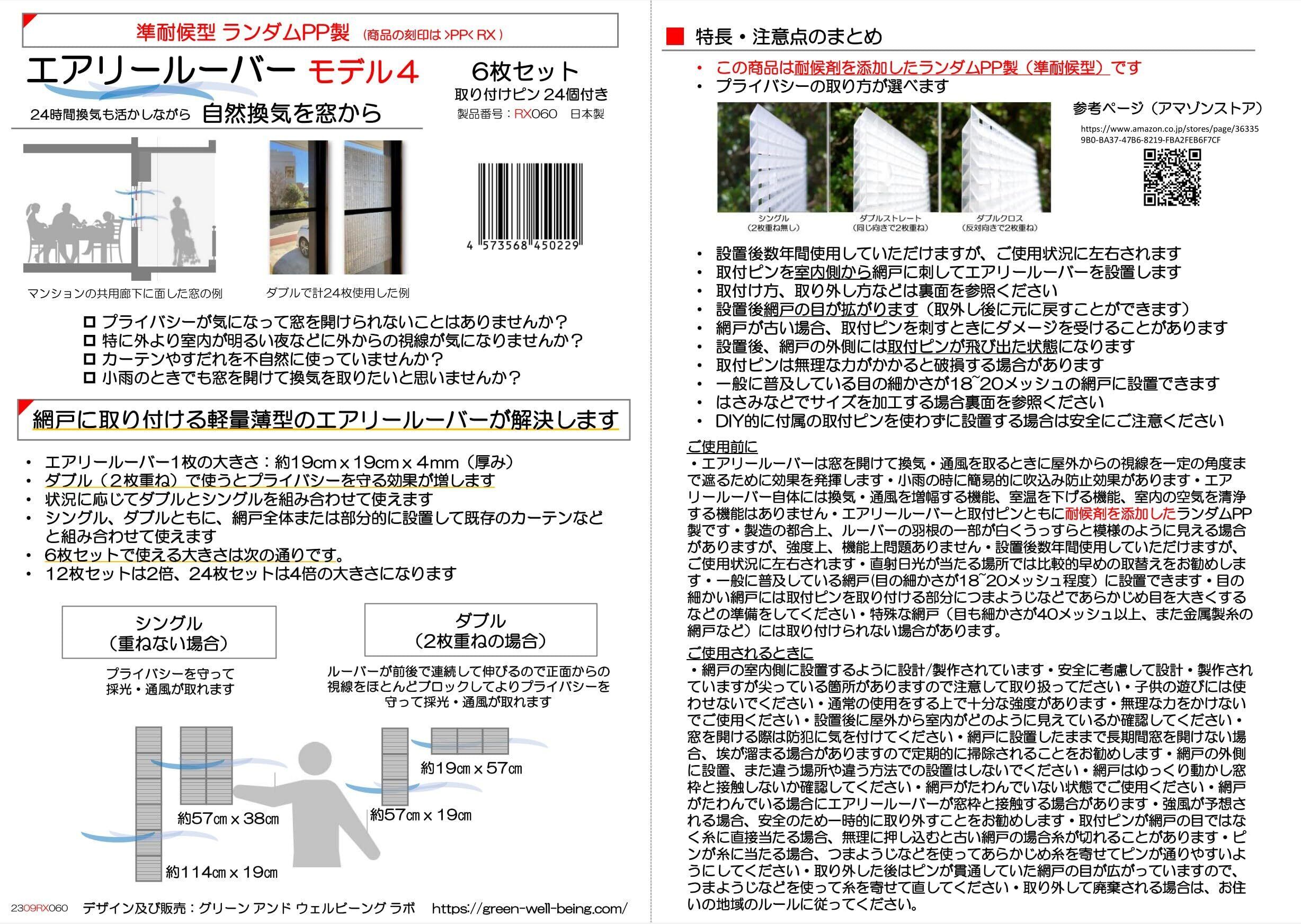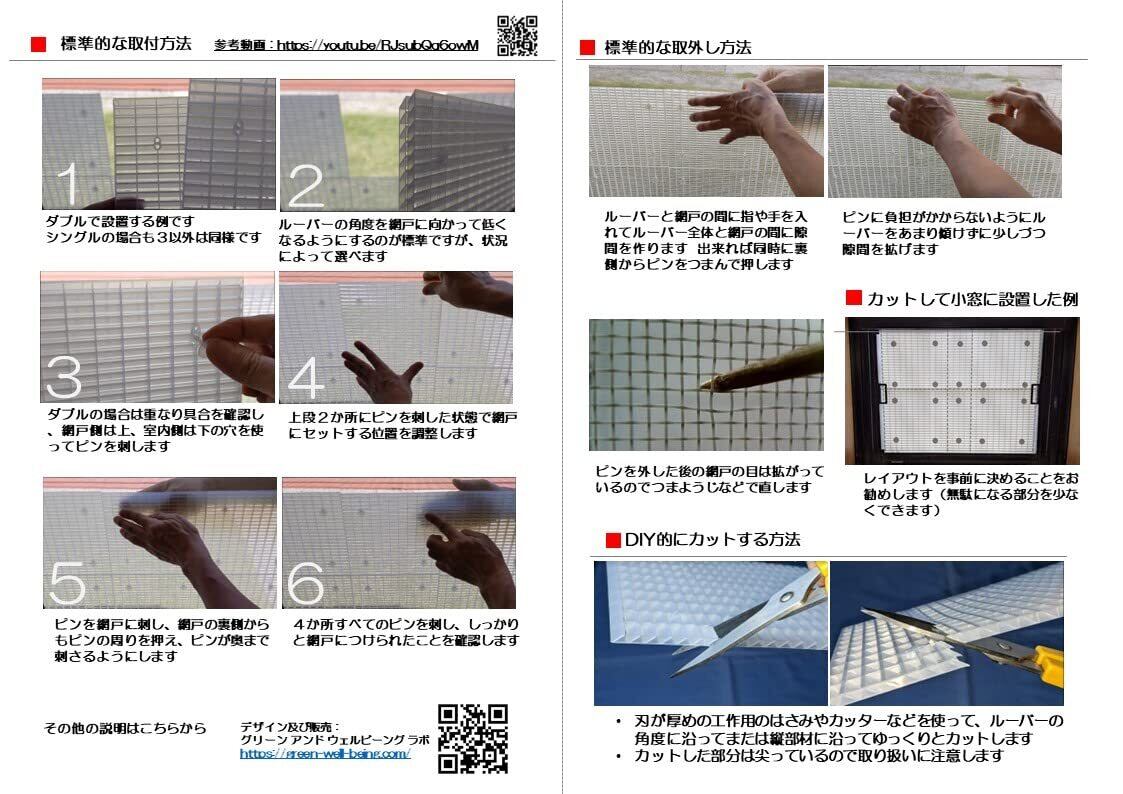 プライバシーを守って換気採光を! 網戸に取付けるエアリールーバー 工事不要でDIY的に簡単取付 賃貸でも 気候のいい時期・時間帯には大きく窓を開けて換気を取りたい。健康で省エネな生活を目指したい。 ただ、窓を大きく開けると外からの視線が気になる。 また小雨のときに雨の吹込みを気にせず窓を開けたい。そんなときエアリールーバーが役に立ちます。 <特長1>:厚さ4mm中に微細加工した半透明のルーバーを配置することでプライバシーを確保します。 網戸にメッシュ状のものを重ねて貼る従来の製品とは違って、エアリールーバーは開口率が著しく下がってしまう心配がありません。換気・通風性能が保てます。<特長2>: 1枚(シングル)でもプライバシー効果を得られますが、2枚重ねて使えるようにデザインされています。 同じ向きに2枚重ね(ダブルストレート)では正面からの視線をブロックできると同時に、室内からは一定角度で外の様子を見ることが出来ます。 裏返して2枚重ね(ダブルクロス)にするとすべての角度からの視線をブロックできます。 詳しくは、https://green-well-being.com/ <特長3>:1枚の大きさが19cm角のエアリールーバーの各ユニットは同梱されている専用のピンを使って短時間で簡単に網戸に取付できます。エアリールーバーを取り付けた網戸を外から見ると取付ピンの先端が出た状態になります。設置できる大きさは12枚シングルの場合、例えば横3枚x縦4枚で設置した場合は約57cmx76cmになります。ダブルで使うと半分の大きさになります。<特長4>:網戸の全体にまた部分的に設置できます。カフェカーテンやブラインドと組み合わせて使えます。ルーバー本体ピン共にポリプロピレン製(モデル2,モデル4)もしくはABS-PMMA製(モデル3)で、ハサミやカッターで加工して使うこともできます。<特長5>:開口率は下がりますが、花粉やホコリが吸着できるフィルターを網戸とエアリールーバーの間に挟んで使えます。