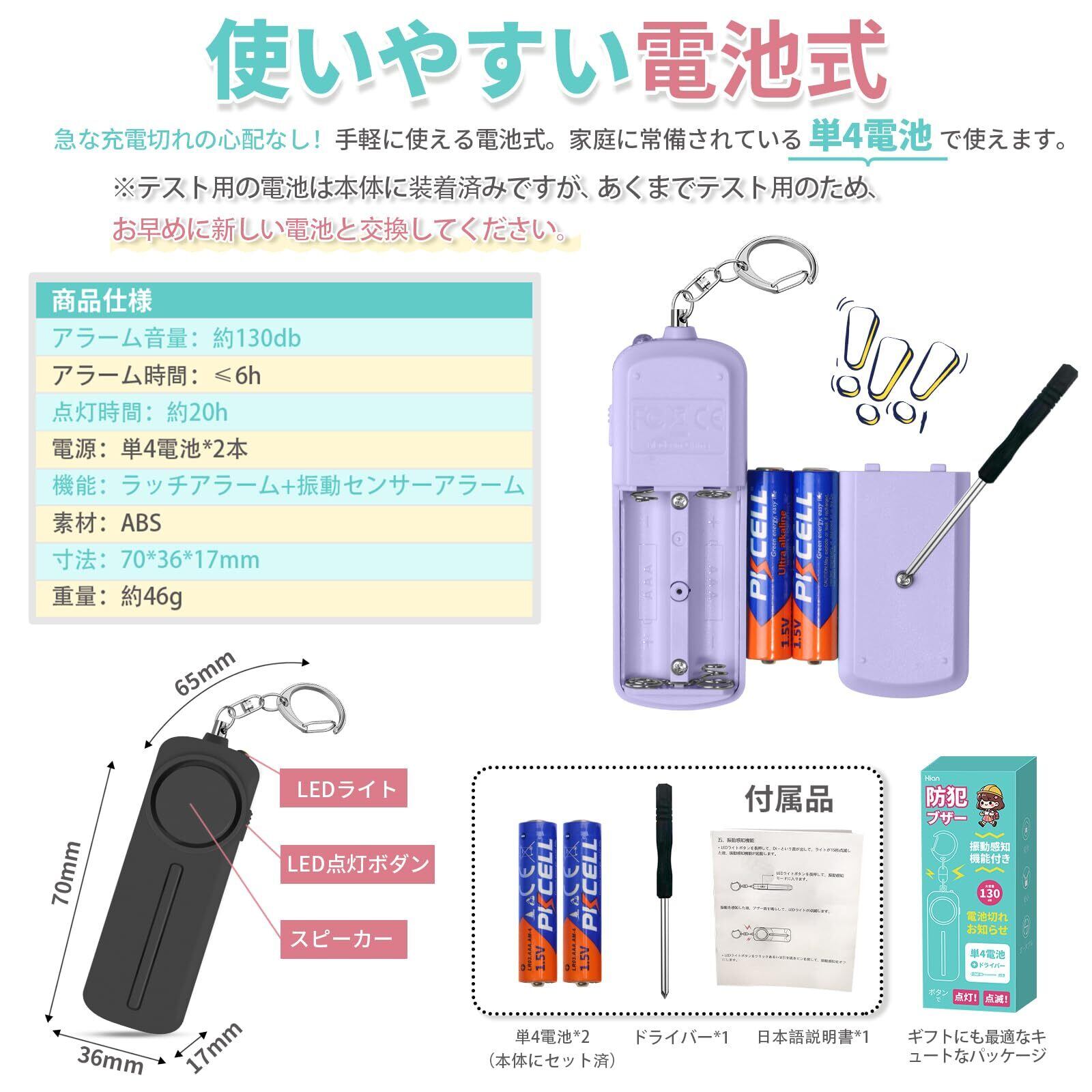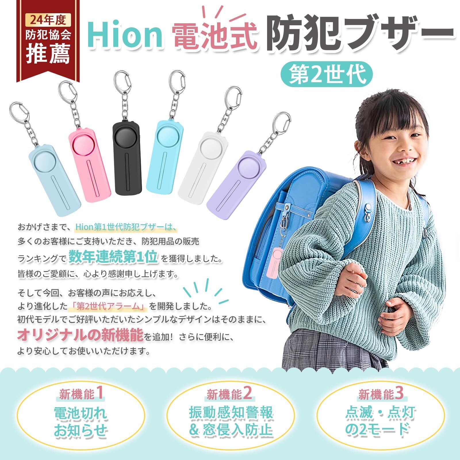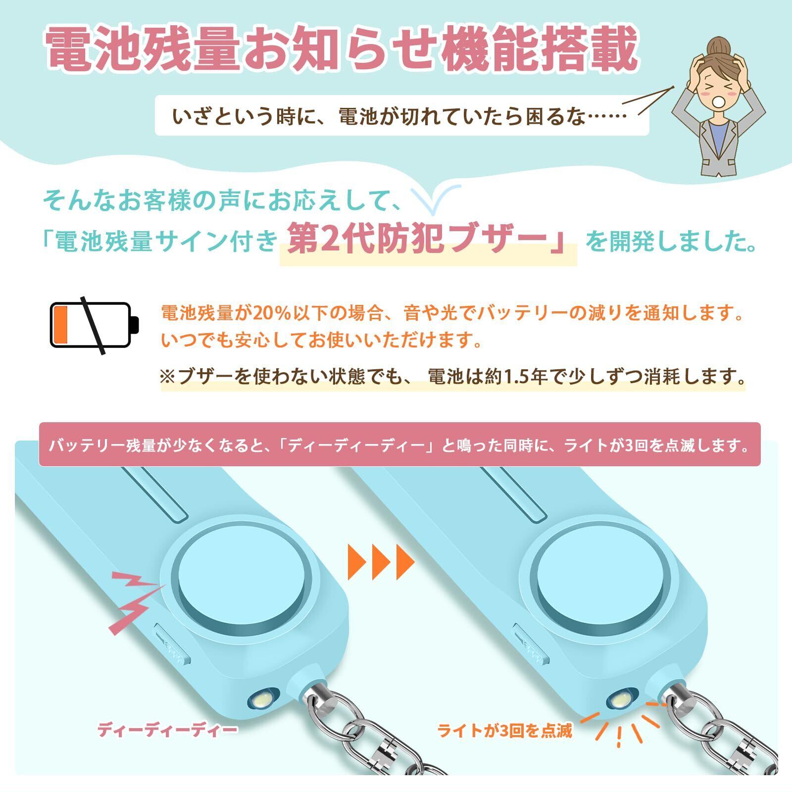 【いざという時に使えなかったら…】そんな不安を解消!Hion防犯ブザー第2代は【電池残量お知らせ機能】を搭載。電池が少なくなると「ピピピッ」と警告音が鳴り、LEDライトが点滅してお知らせします。単四電池式で交換もラクラク。日常の安心を、しっかりサポート!子どもから大人まで使いやすい設計で、防犯・防災の備えに最適。登下校中の小学生(男の子・女の子)はもちろん、一人暮らしの方や通勤・通学時の女性にもおすすめです。