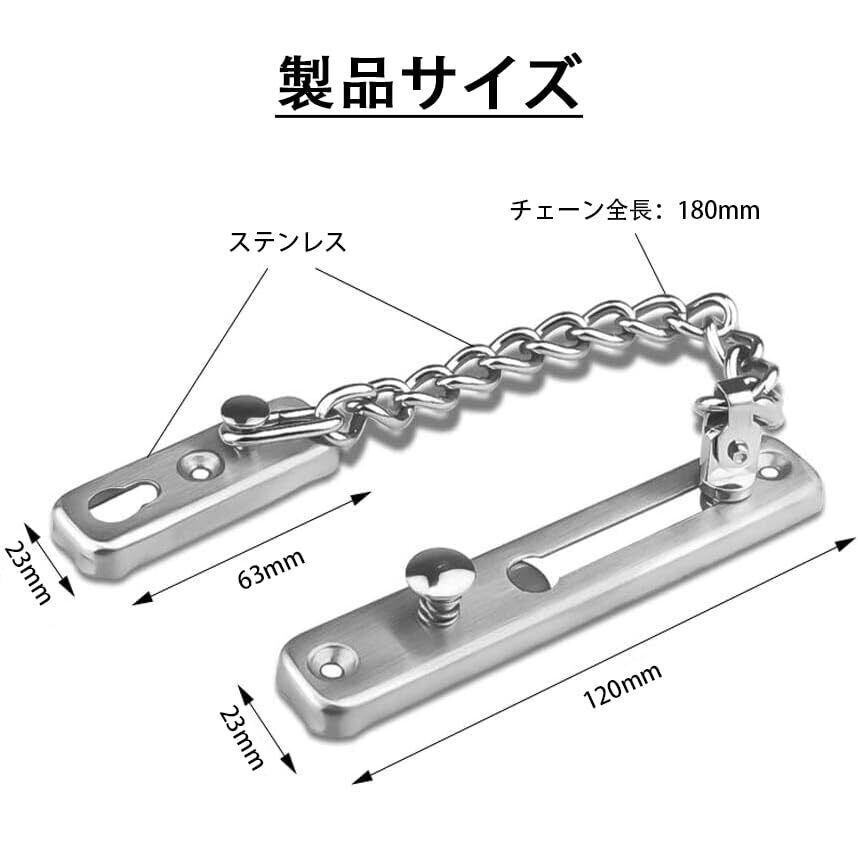 1.【セット内容】ドアチェーンプレート(本体カバー部)×1 、チェーンホルダー×1 、取り付けビス×4 2.【使い勝手】ステンレスドアチェーンは縦でも横でも使用することができ、賃貸マンションにも使いやすい。 開き勝手を選ばない左右兼用タイプで左、右開き、どちらのドアにも取り付け可能。 3.【上品な材質】ドアチェーンは、腐食、摩耗、高温に強い高強度ステンレスで作られており、錆びにくく、丈夫で、あらゆる過酷な環境に耐えるます、チェーンの部分は太くしたことで、切りにくく、防犯レベルを有効的にアップさせます。 4.【盗難防止用チェーン取り付けガイド】木製ドアの取り付け:ドライバーで直接ネジを締め、ねじ込んで締め付ける。 5.【様々なシーンで活躍】扉を少し開いた状態で訪問者に応対したい時や室内を換気したいけどドアを開放したくない時、また子供が勝手にドア開けるのを防止対策として、女性の一人暮らしの防犯対策として様々なシーンで大活躍。