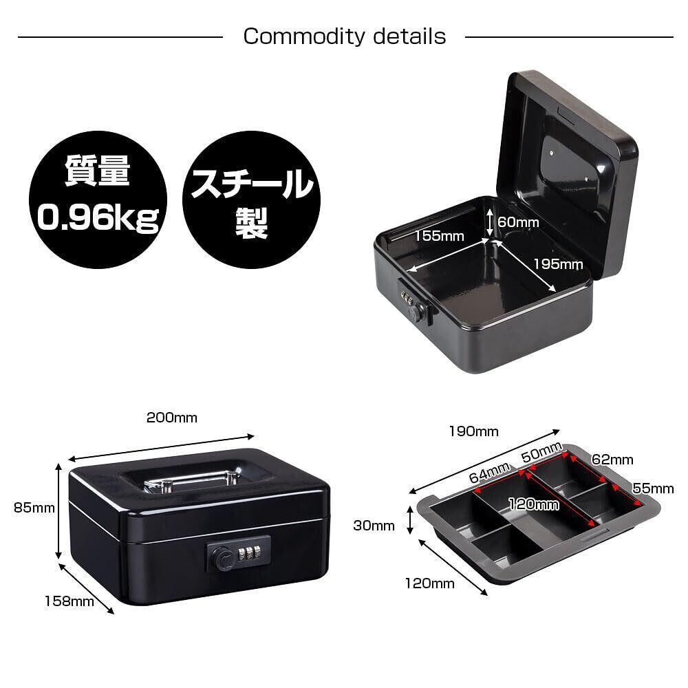 スチール収納ボックス。3桁ダイヤル式ロック。トレー付き。