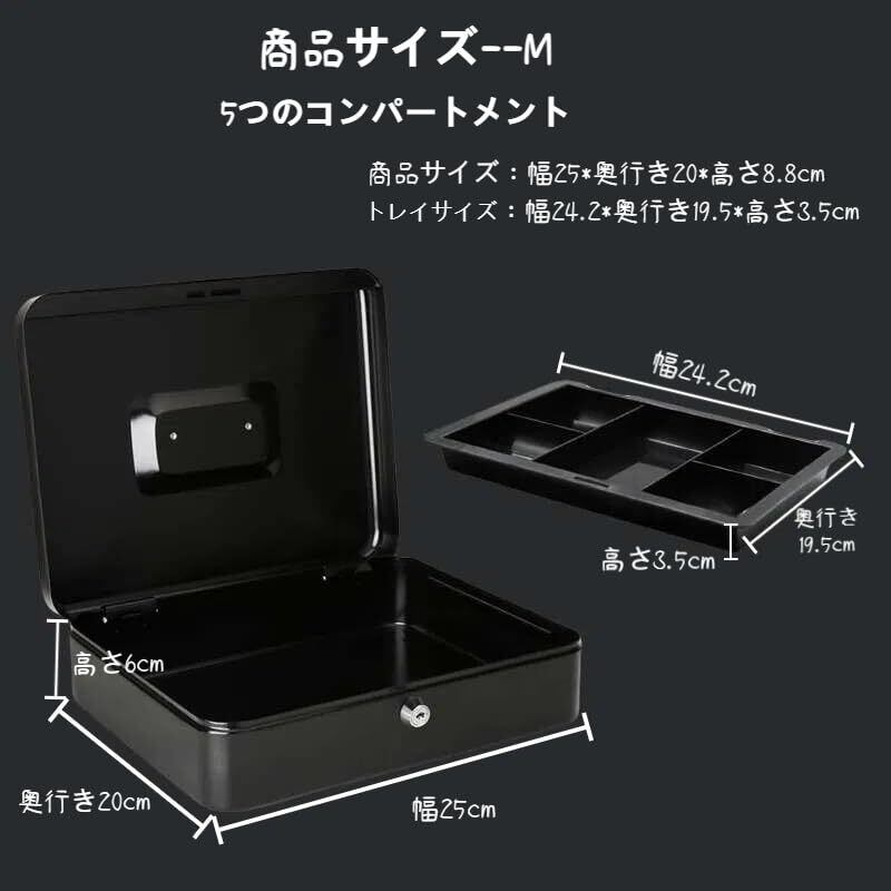 Point 5【十分な収納スペース】商品サイズ:幅25cm*奥行き20cm*高さ8.8cmさらに収納性を高めるために、内側にABS製の取り外し可能なトレイを配置しました。もちろん、トレイを外してそのまま金庫や貯金箱として使うこともでき、内部のスペースをより広く使用できます。(トレイを外す場合に、内部サイズ:幅24.8cm*奥行き19.8cm*高さ8.5cm).