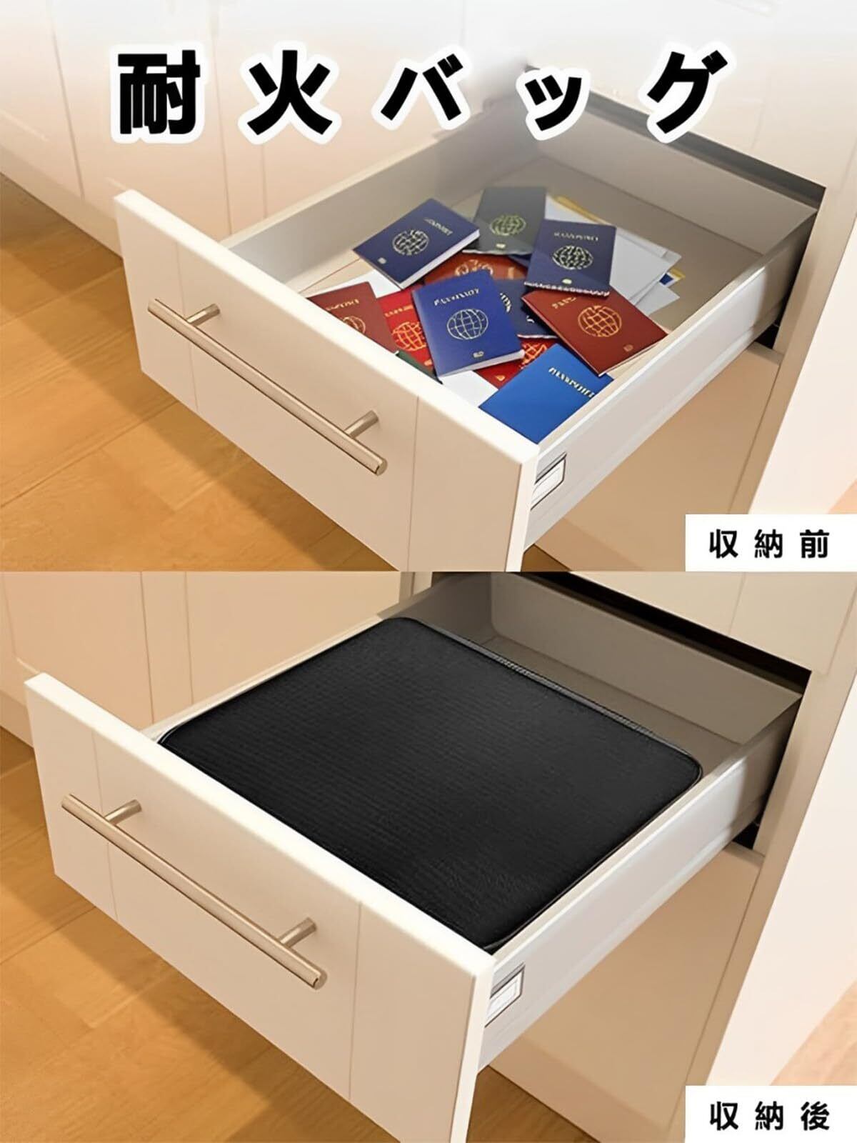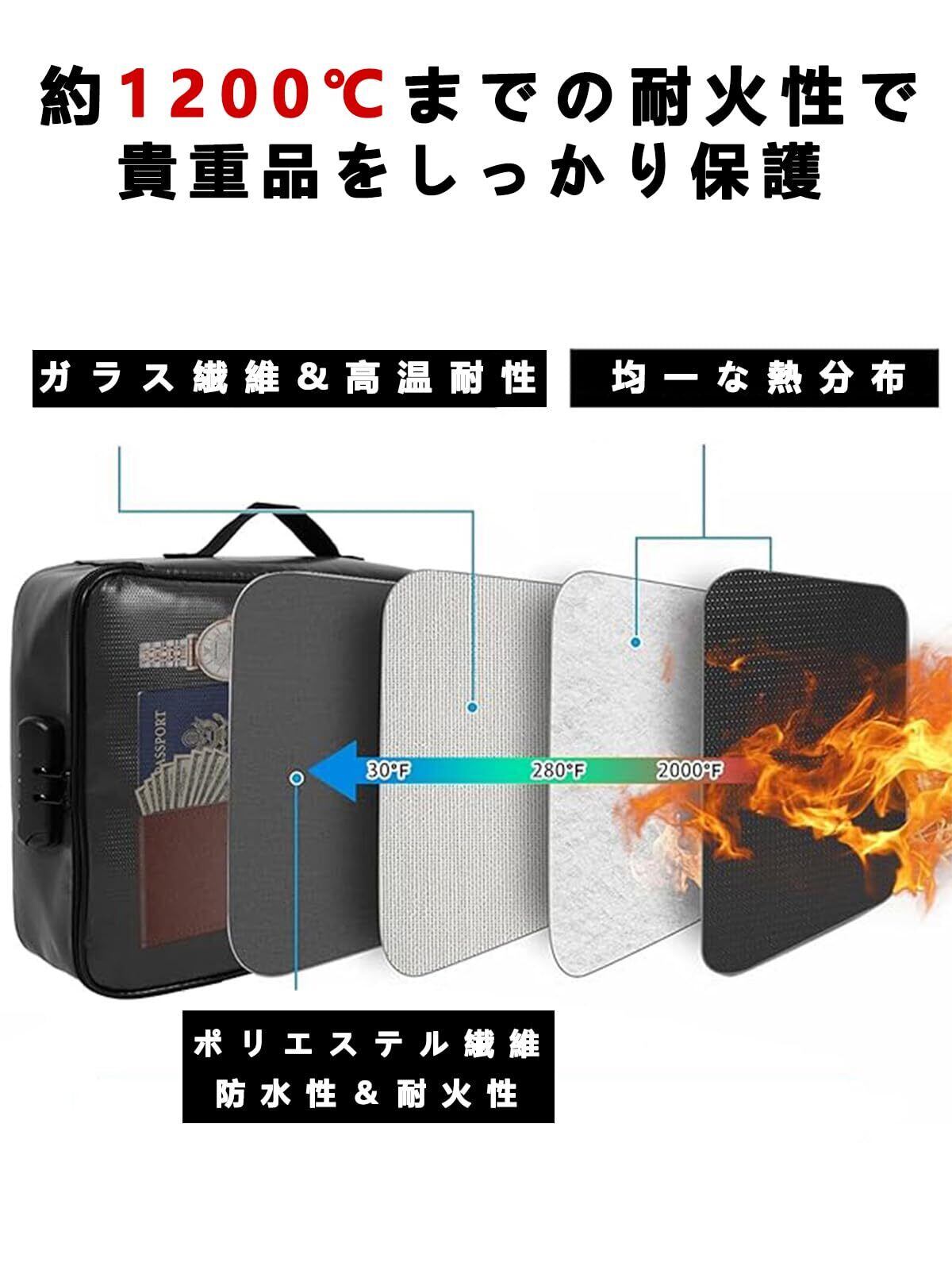 【優れた耐火×防水性】本製品は耐火性能の試験認定を受けています(UL94 VTM-0)、外側にガラス繊維生地を採用しており、約1200℃の高温にも耐えることができ、貴重品を確実に保護します。さらに、防水機能を強化し、雨で水の浸入を防ぎ、書類が濡れる心配がありません。汚れに関しても、簡単に拭き取ることができます。重要書類を保管、火事や水害から守ってくれる 。