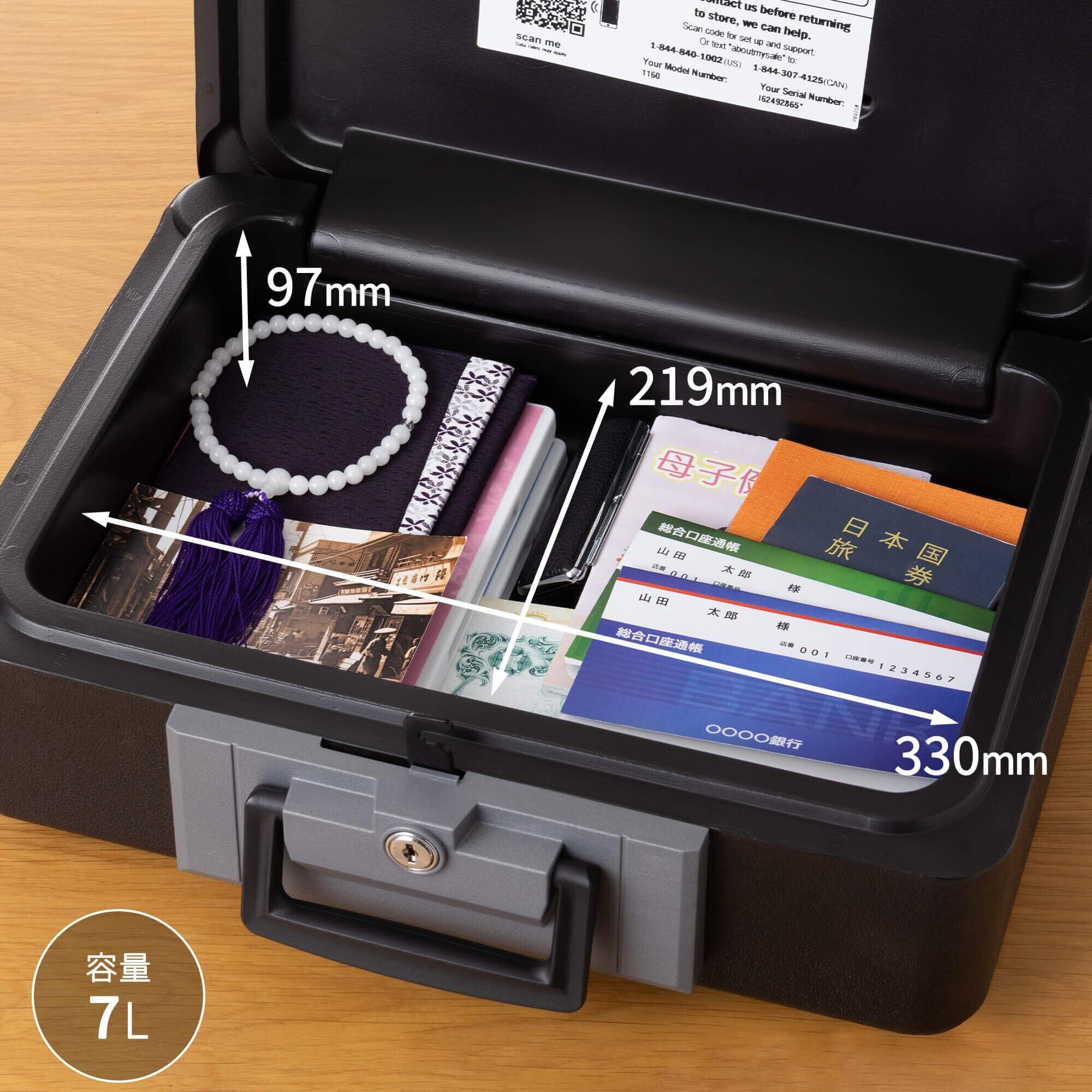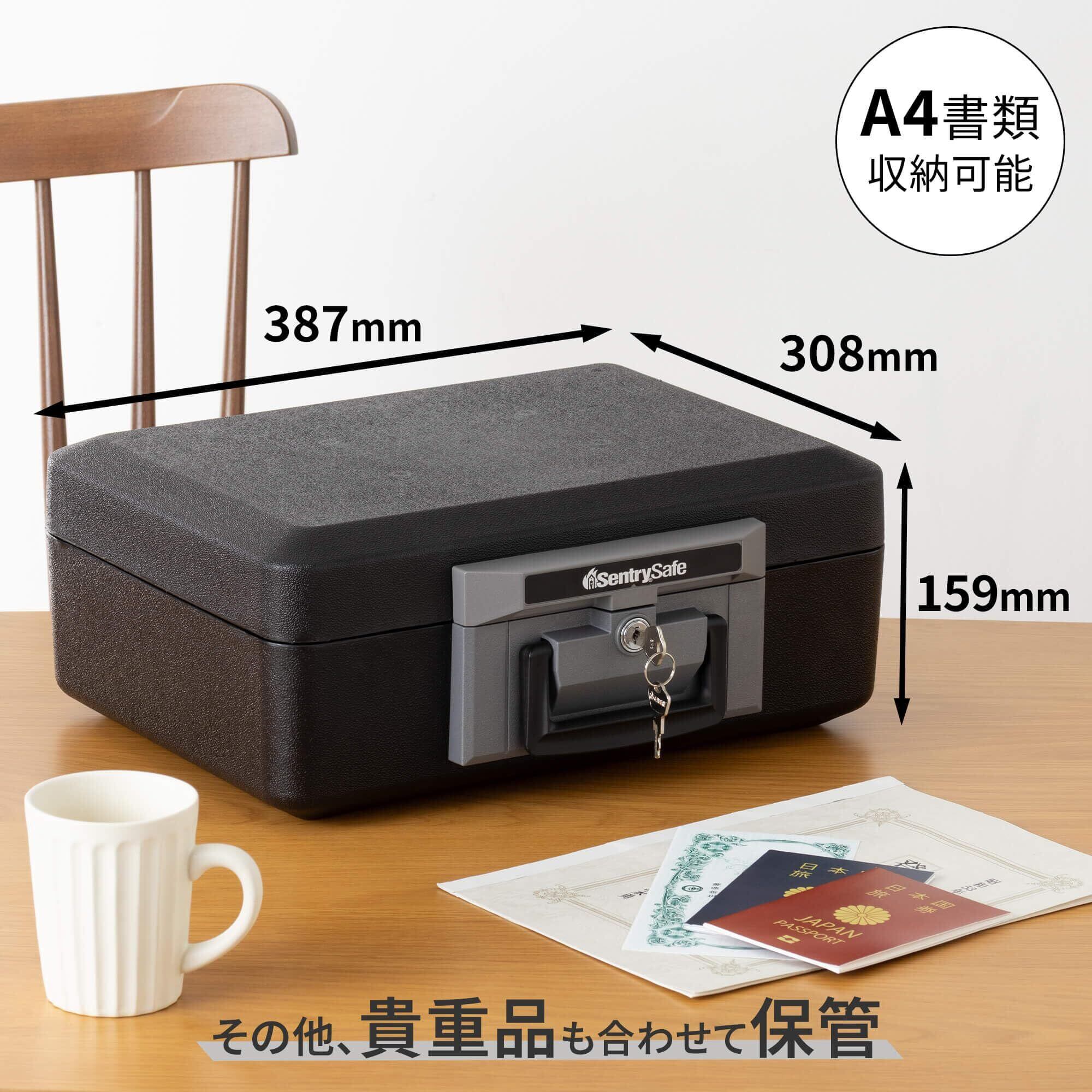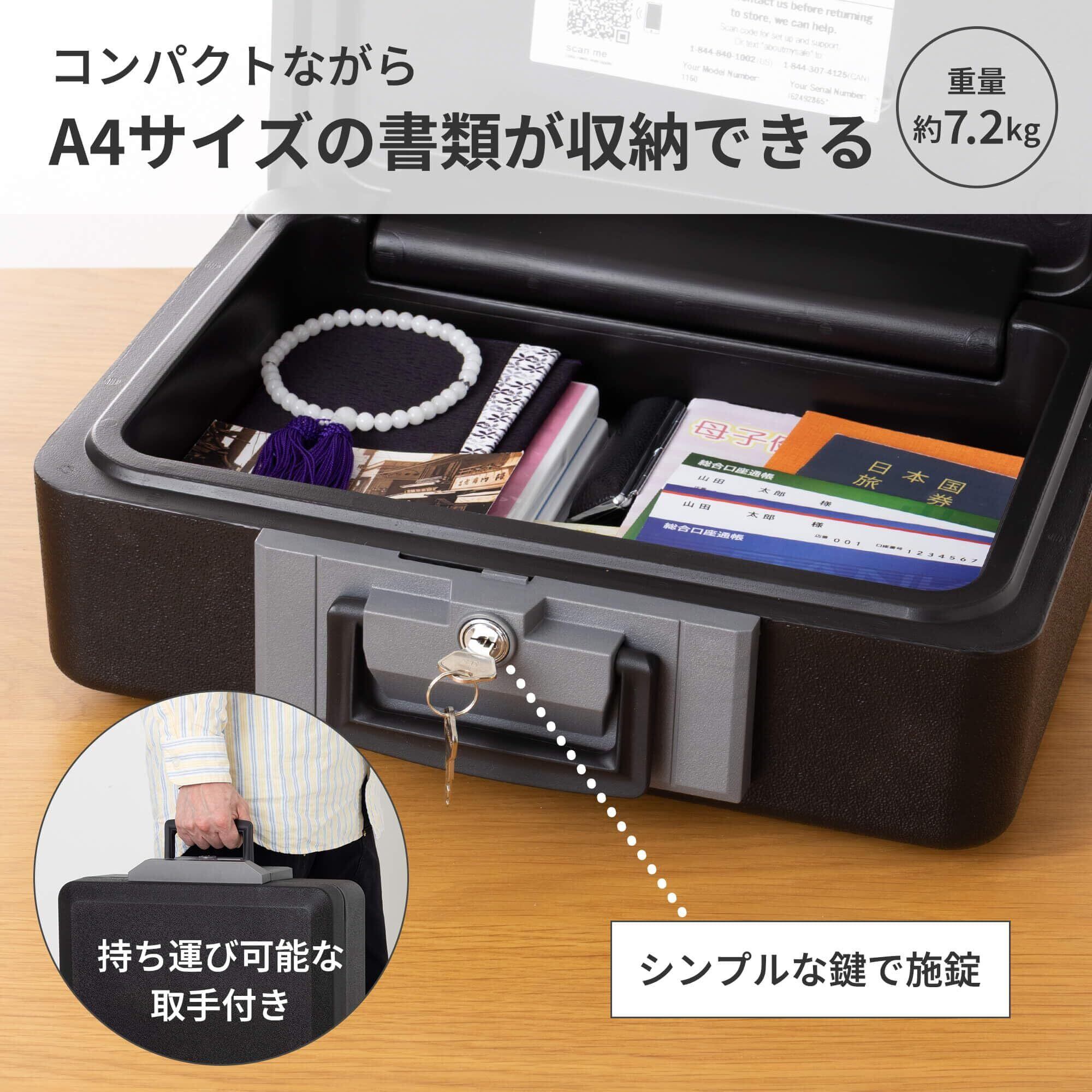 【収納場所を選ばない手頃なサイズ】・クローゼットの棚やキャビネットの引き出しなどにも収納可能。・A4用紙がぴったり収まる容量で重要書類の保管に適しています。・外寸:幅約38.7×奥行約30.8×高さ約15.9cm・内寸:幅約33×奥行約21.9×高さ約9.7cm・容量:約7L 質量:約7.2kg