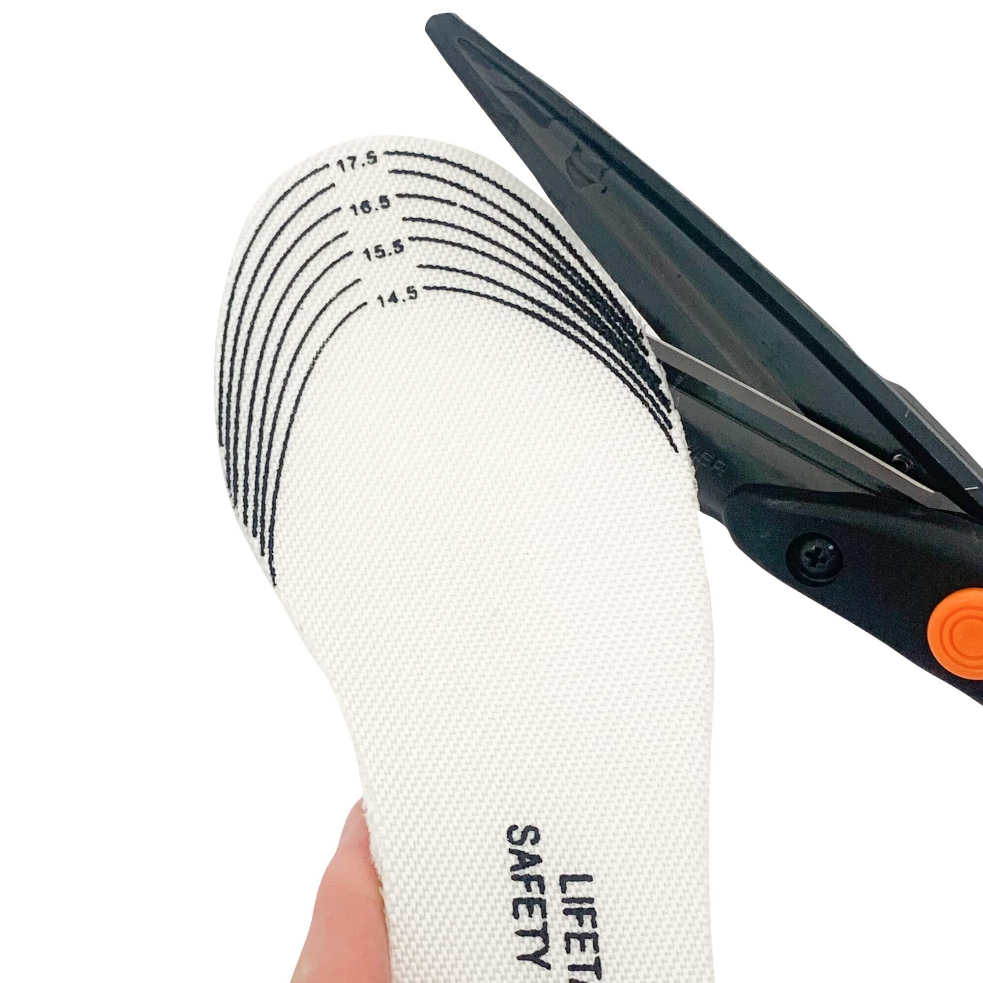 使用方法: 靴のサイズに合わせ、インソールの線に沿って切り取ります。 切り取ったインソールを靴の中に入れます。 ※メーカーによっては靴のサイズが異なる場合がありますので、少しずつ調整してください。