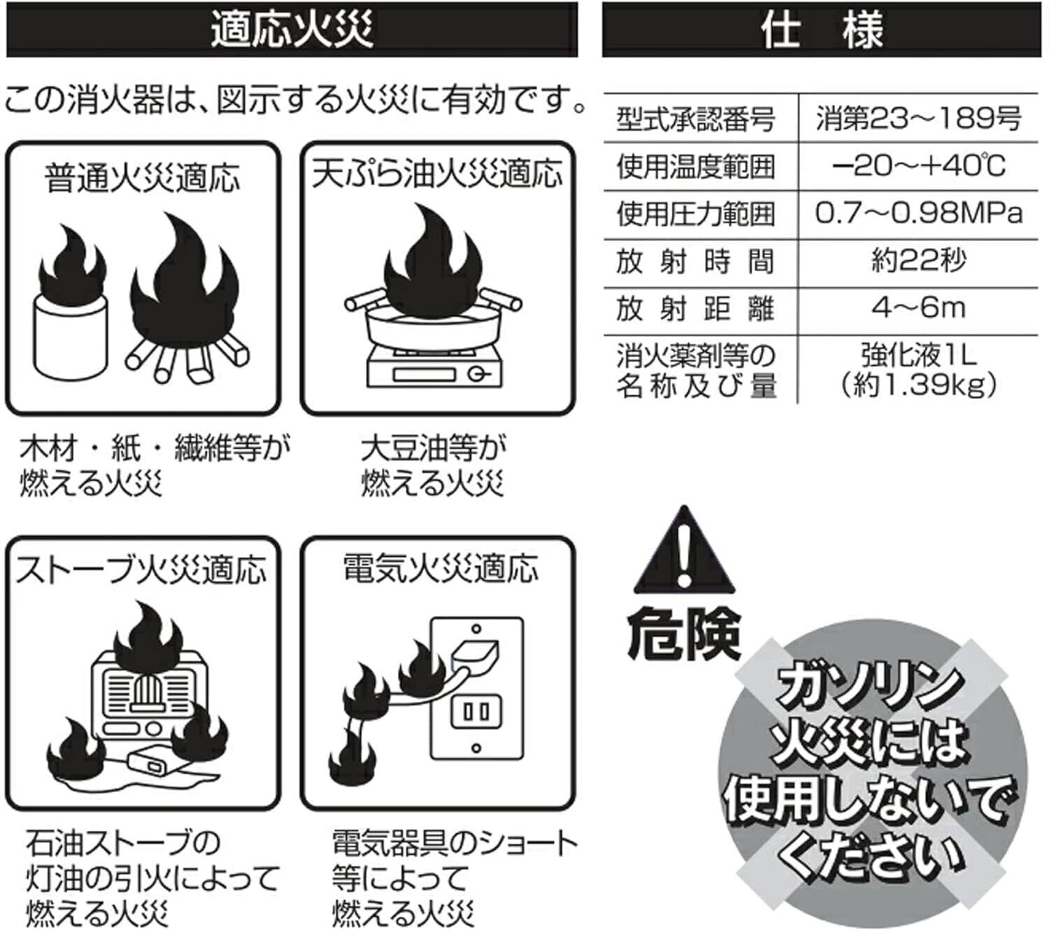 総重量:2.7kg、消火薬剤/薬剤質量:強化液/1L、放射時間/距離:約22秒(20℃)/約4~6m、適応火災:普通火災/天ぷら油火災/ストーブ火災/電気火災、規格:国家検定合格品、設計標準使用期限:5年、