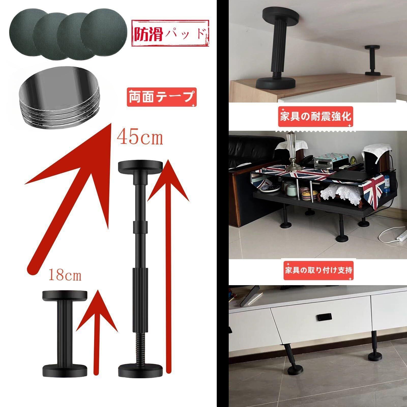 (高さ18-45 cm)家具転倒防止 突っ張り棒 家具の転倒を防ぐ伸縮可能な固定バー 黒い家具の固定フット 大型家具と天井の隙間を埋めるための大型固定バー 滑り止めパッドと強力な両面テープが付属した防震固定バー強化セット 長さ調節可能な家具災害防止用固定ツール 2個セット