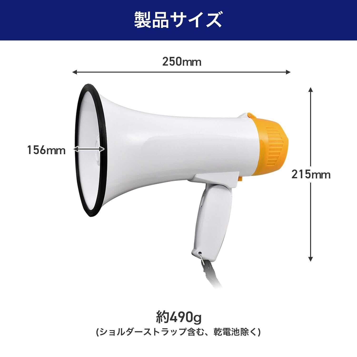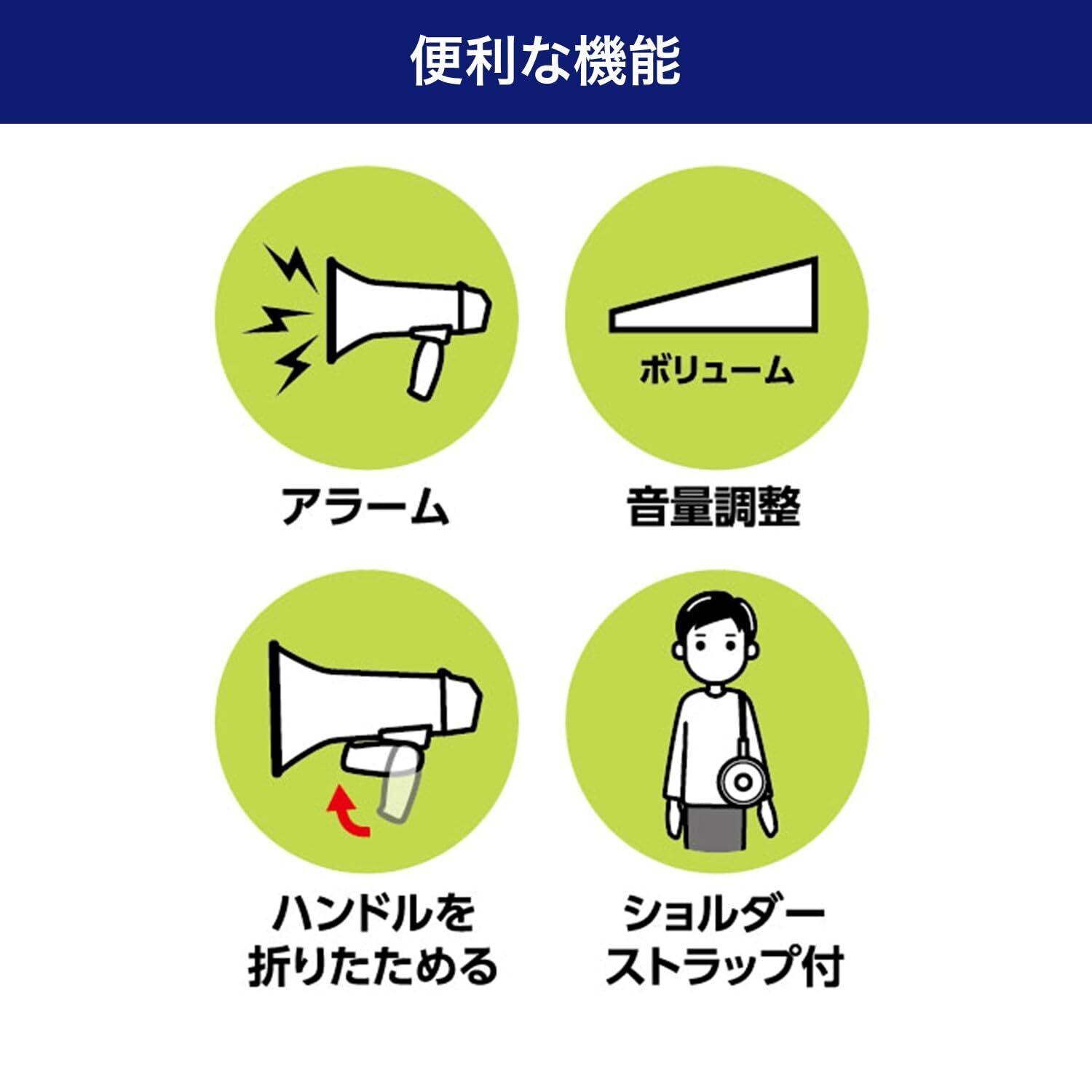 ■使用電池:単二形アルカリ乾電池×4本(別売) ■連続使用時間:約9時間(音量最大アラーム時) ※アルカリ乾電池使用時 ※電池の性能、使用条件により連続使用時間は短くなる場合があります。 ■出力:最大9W ■有効距離:約100m(音量最大アラーム時) ※アルカリ乾電池使用時 ※周囲、使用の状況により有効距離は短くなることがあります。 ■音量:100dB/m(音量最大アラーム時) ※アルカリ乾電池使用時 ■マイクロホン:コンデンサーマイクロホン ■外径寸法(約):幅250×高さ215×奥行156(mm)(最大値) ■質量:約490g(ショルダーストラップ含む、電池除く) ■付属品:ショルダーストラップ