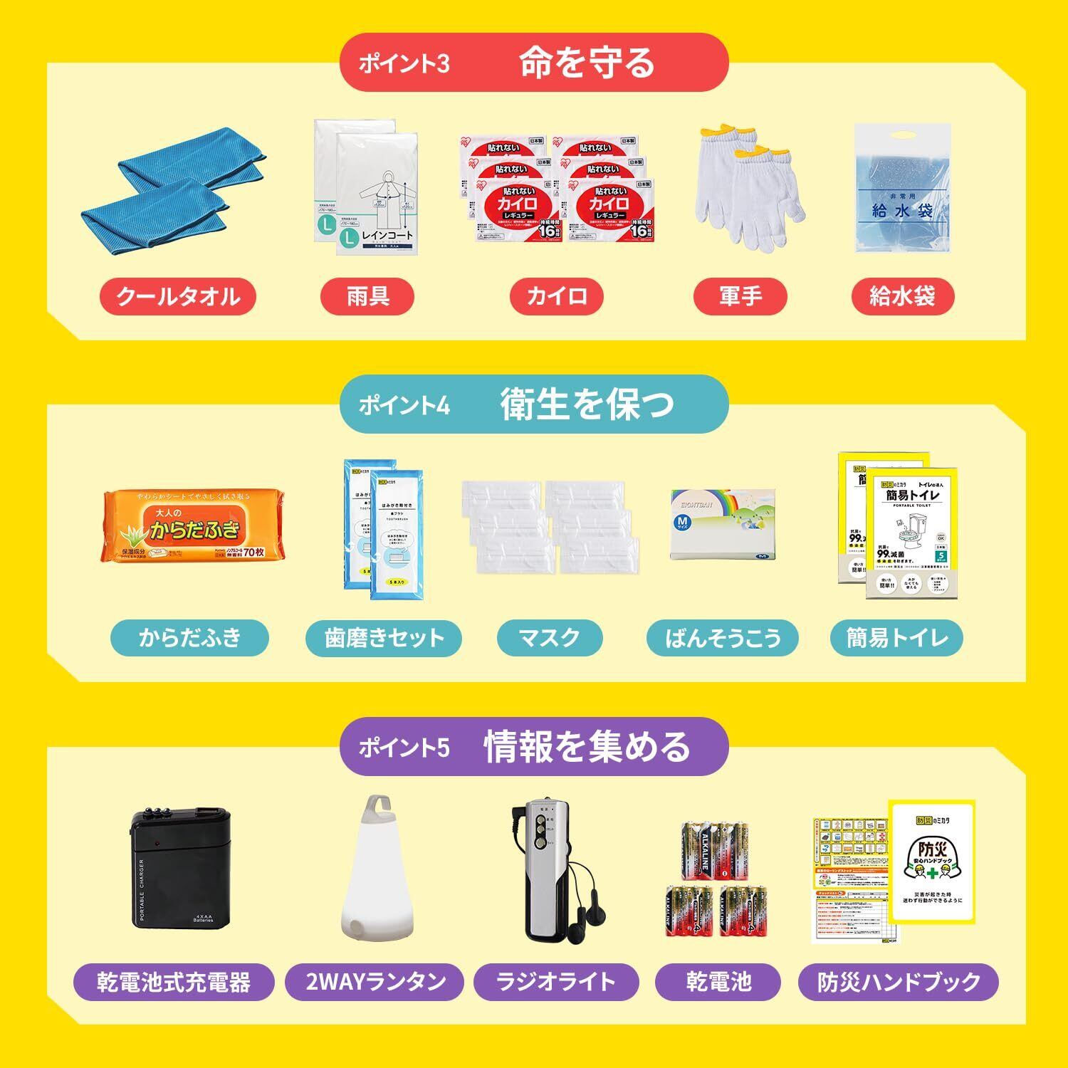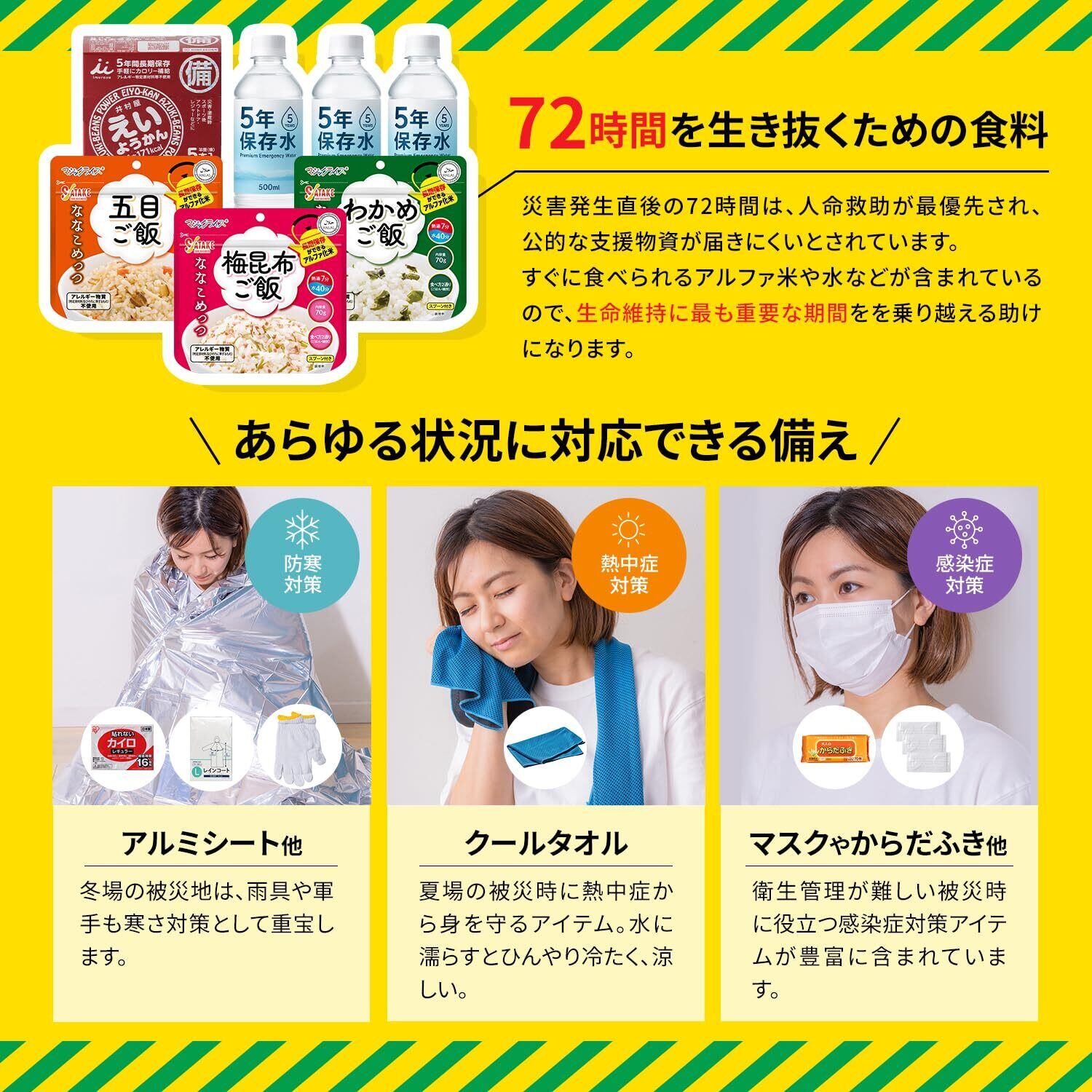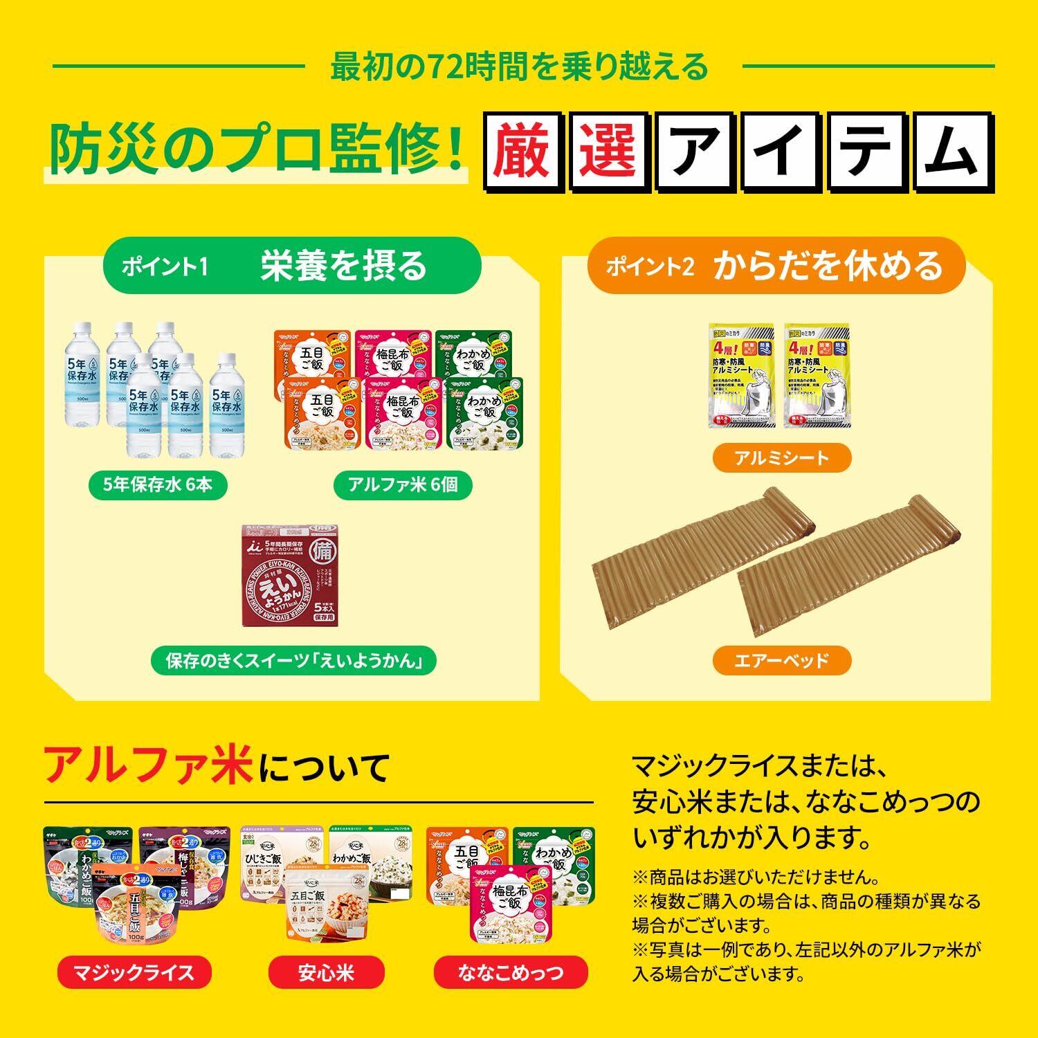 【こだわりの防災グッズたち】防災のミカタは実際の被災生活経験者の声を参考に防災士監修のもと、本当に必要なものを選び抜いた非常用持ち出し袋です。避難生活時に情報収集アイテムとしてかかせないラジオ、スマホの充電器。発電式だと時間と体力を消耗して災害時に使いにくいため、すぐに使える乾電池式を採用しています。被災生活を少しでも楽に過ごせるように、エアーベッドを用意。体育館等の固い地面でも快適に過ごすことが出来ます。その他防災リュックの実はここがしんどい、辛いという部分を改善し、快適で安心できるこだわりの防災グッズだけを集結しました。だからこれさえあれば大丈夫!防災のミカタでいざというときに備えましょう! (※セットの内容は商品の入荷状況によって商品パッケージや色が違う場合や、品質が同等の商品で代替対応させていただく場合がございます。)