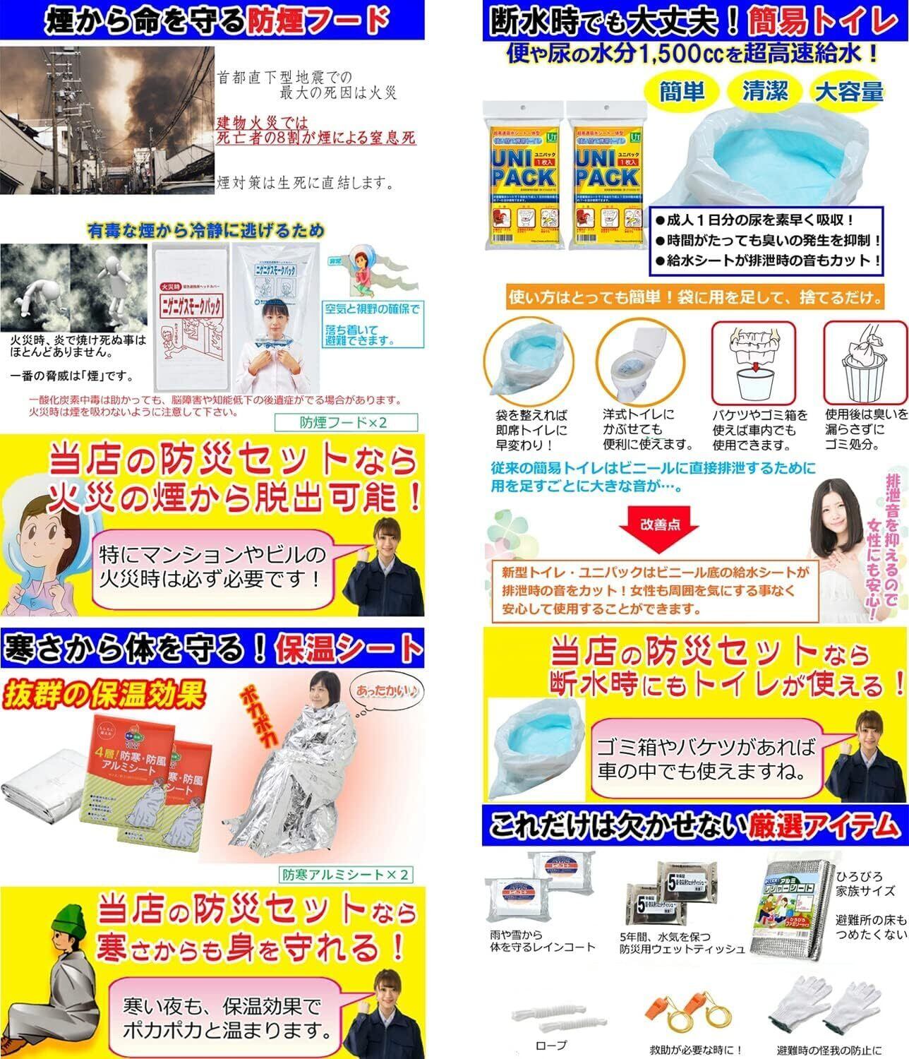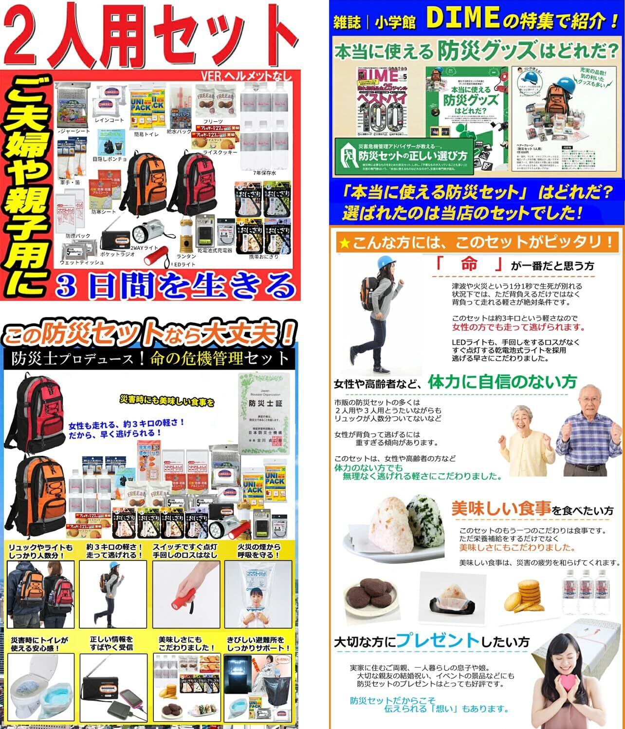 大切な家族を守る防災セットです。ご家族やご夫婦での避難に便利な、2人用の防災セットです。1人あたりの重量は、わずか約3キロの軽さなので、女性や高齢者の方でも、いざという時には走って逃げれるセットです。