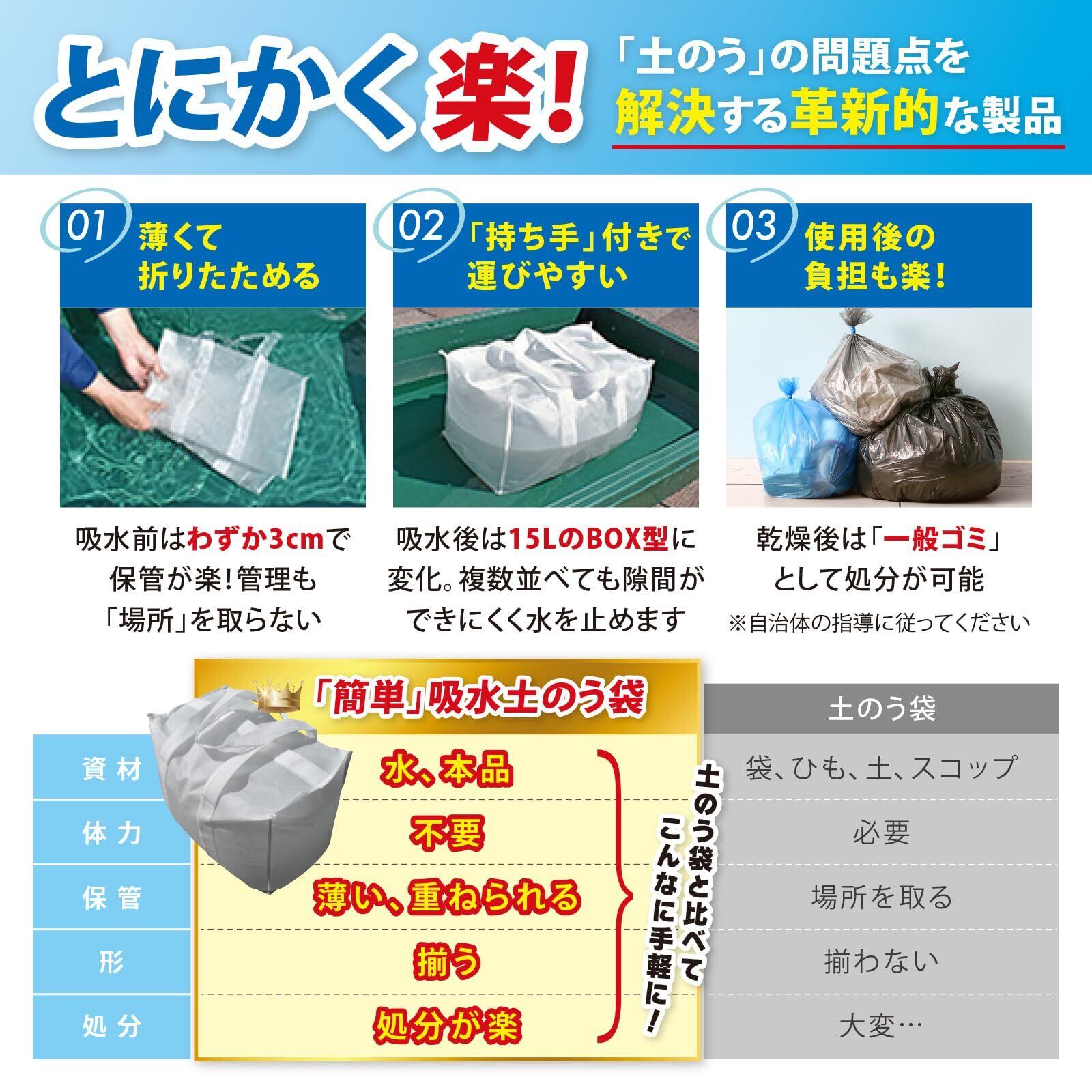 【BOX型で隙間をブロック!逆流防止にも】 吸水後は15LのBOX型に変化し、並べた際に隙間ができにくい設計です。玄関、車庫、店舗の止水板代わりに最適。トイレや排水溝にセットすれば、下水の逆流を防ぎ室内を汚染から守る水土嚢袋(水嚢・給水土嚢)としても機能します。