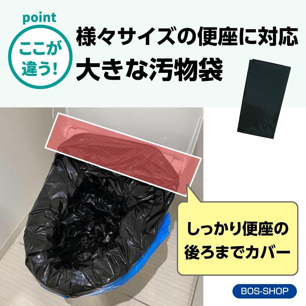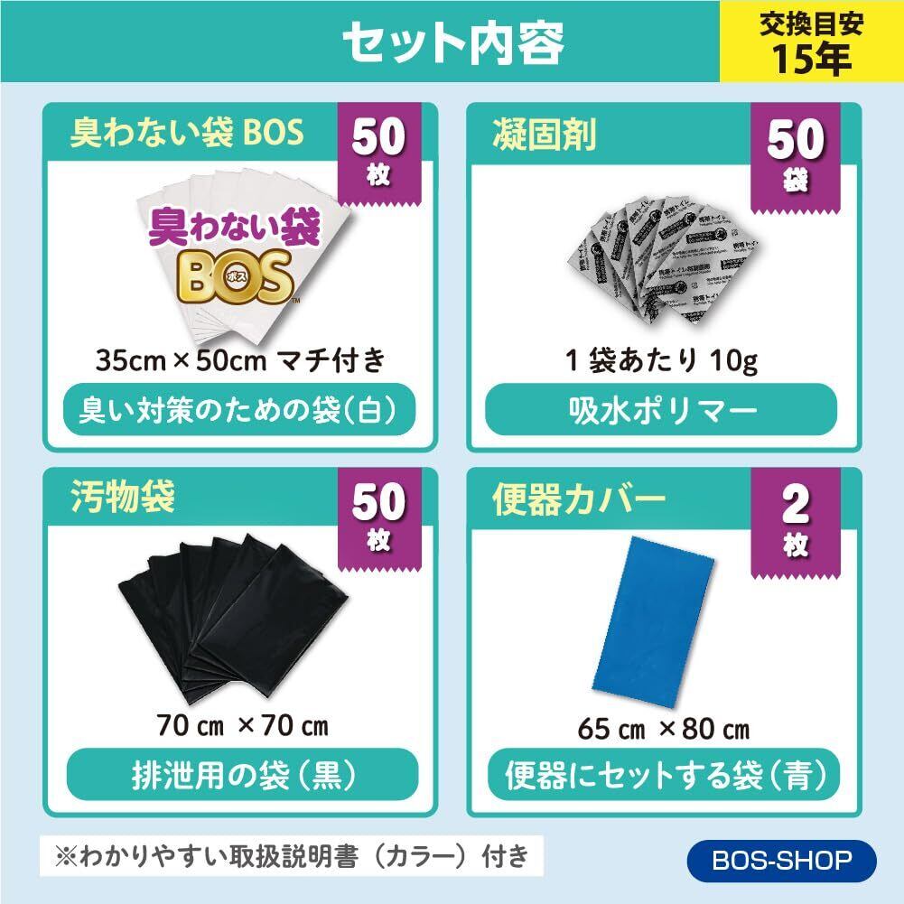 臭わない袋BOS、凝固剤、汚物袋、便器カバーの4点セット+カラーで見やすい取扱説明書付き