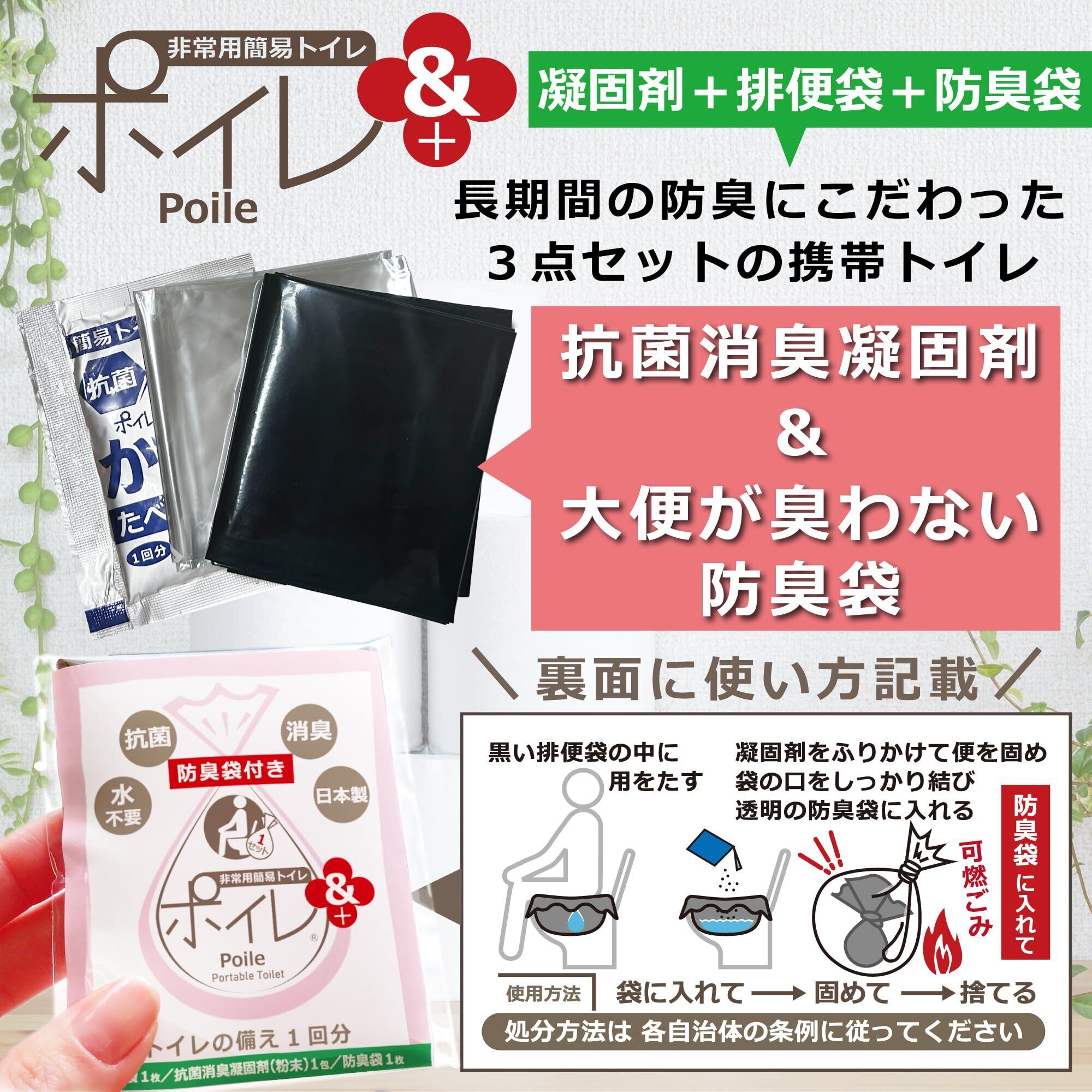【 内容 】個包装1回分:抗菌性凝固剤「ポイレかた丸」×1包(高吸水性ポリマー)/排便袋(黒)×1枚(ポリエチレン650mm×480mm)/防臭袋(透明)×1枚 [250×380mm]/使い方・使用期限はパッケージ裏面に記載/ ※凝固剤は粉末です。使用する際に粉が舞うことがございますので、むせてしまわないよう、顔を近付けないようご注意ください。