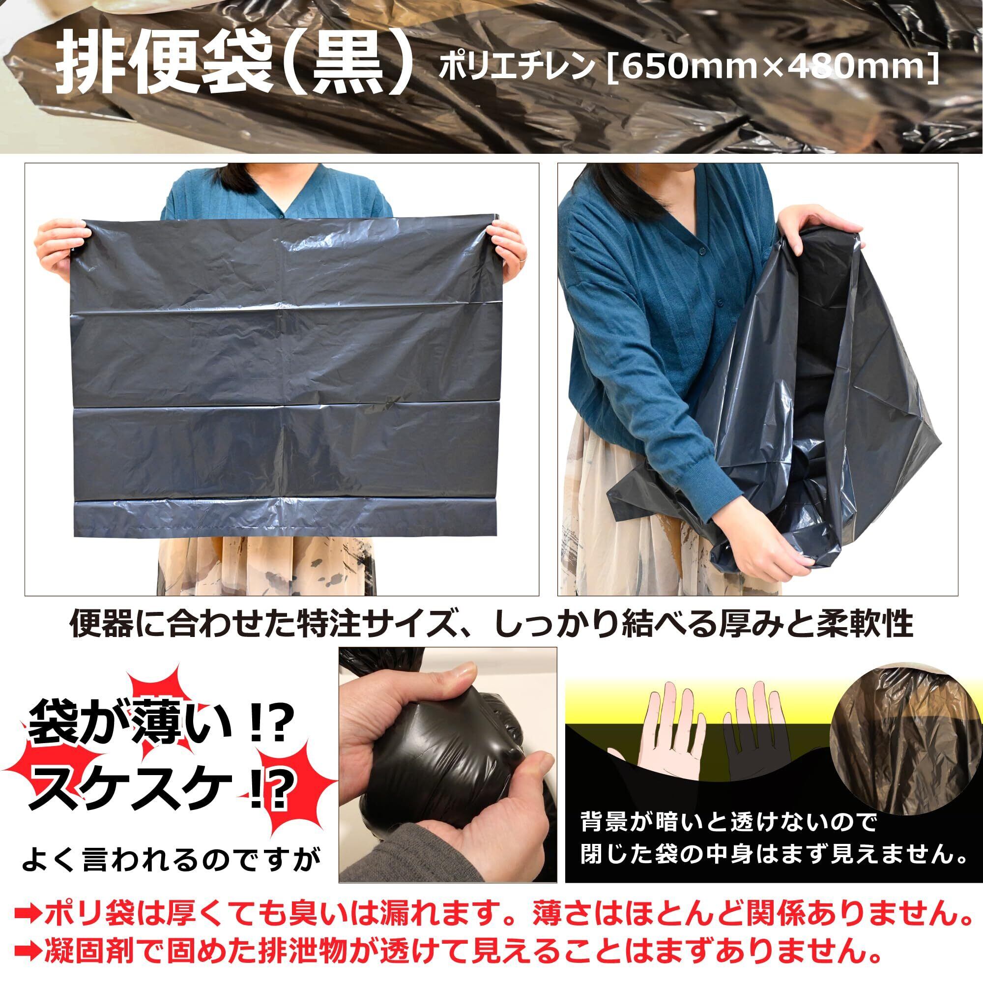【 排便袋について:扱いやすい厚みとサイズ 】簡易トイレ用の処理袋としての扱いやすさを考え、日本の便器に合わせた幅広・底浅のサイズで作っています。「袋が薄い」とお声をいただくこともございますが、臭い漏れの大きな原因は袋の薄さよりも結び目の隙間にあります。分厚い袋は一見しっかり臭いを防ぐように見えますが、ポリ袋だけで臭いを防ぐことはできません。また、しっかり袋を結んで閉じれば中身が透けて見えることはまずありません。【便器にかぶせ、排泄物を入れて閉じる】という簡易トイレの用途に合わせた厚みとサイズです。