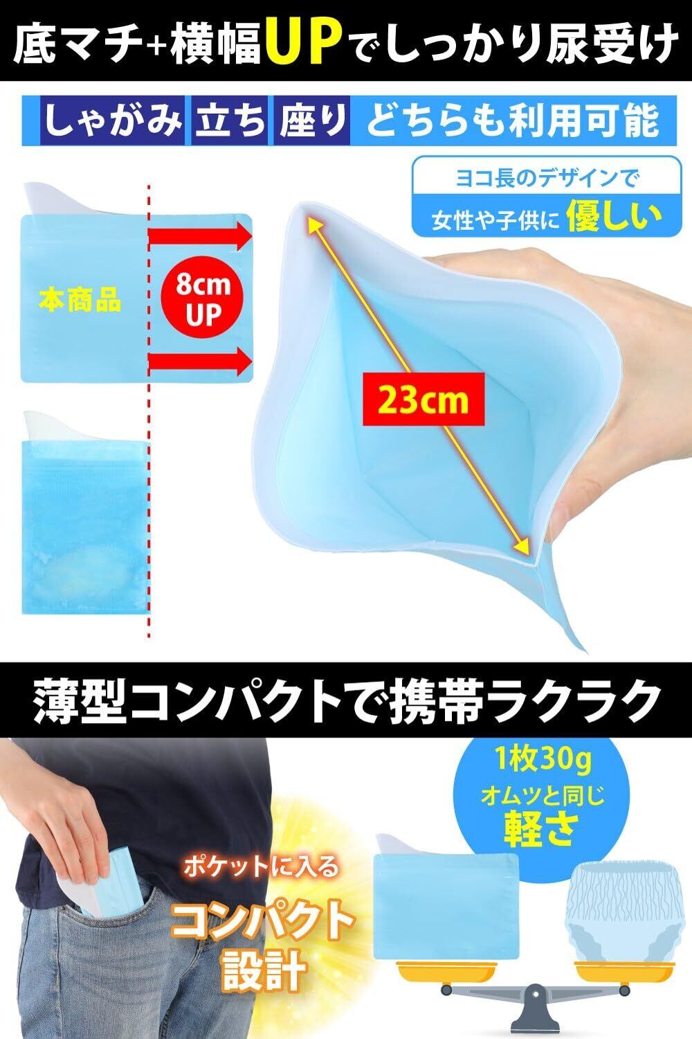 【しゃがんで使える】底マチ付きで地面に自立できるようになりました。従来商品より横幅が更に8cmアップすることで女性、子供でも使いやすいサイズになりました。トイレがやりずらいこともなく、適度なサイズでしゃがんで使用可能な携帯トイレです。車内でもサイドポケットに入れておくことができる、薄型サイズです。薄くて軽いため、バッグの中に用意に入れておくことができ、いつでもどこでもトイレをすることが可能です。