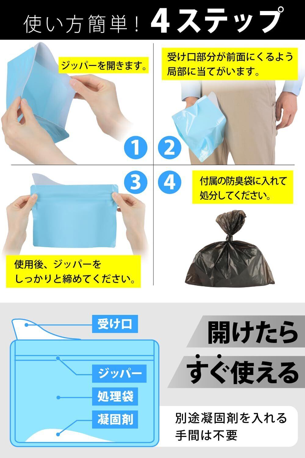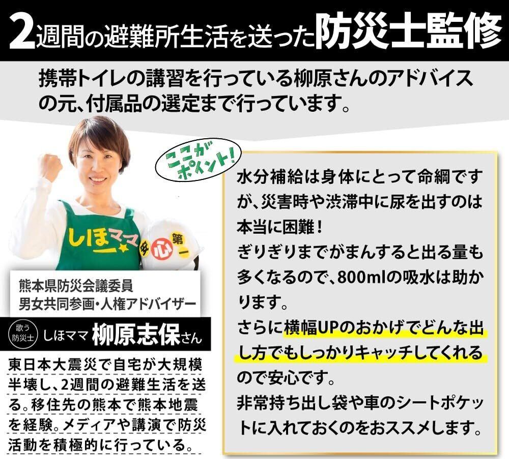 【様々な用途に使える】非常用トイレは登山やキャンプ、車中泊などのアウトドアやトイレが近いお子様の渋滞中の車内、トイレのないボートなど幅広い分野でお使いいただけます。山を汚さず、マナーとしてご活用ください。車酔い 船酔い 乗り物酔いのエチケット袋としてご使用いただけます。急な断水工事でトイレが使えなくなったとき、地震や台風などの防災用品として、トイレが使えなくなった場合に重宝します。災害グッズ、防災用品、避難グッズとして備蓄しておくと安心です。携帯トイレは介護や怪我のとき、トイレにすぐにいけない場合にも活躍します。