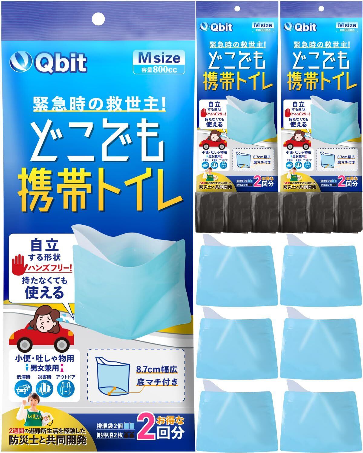 Qbit どこでも携帯トイレ 小便用 非常用/災害用/簡易トイレ 選べる形 エチケット袋 車 渋滞 登山 防災グッズ 廃棄袋付 男女兼用 (受け口付 Mサイズ 6回分)