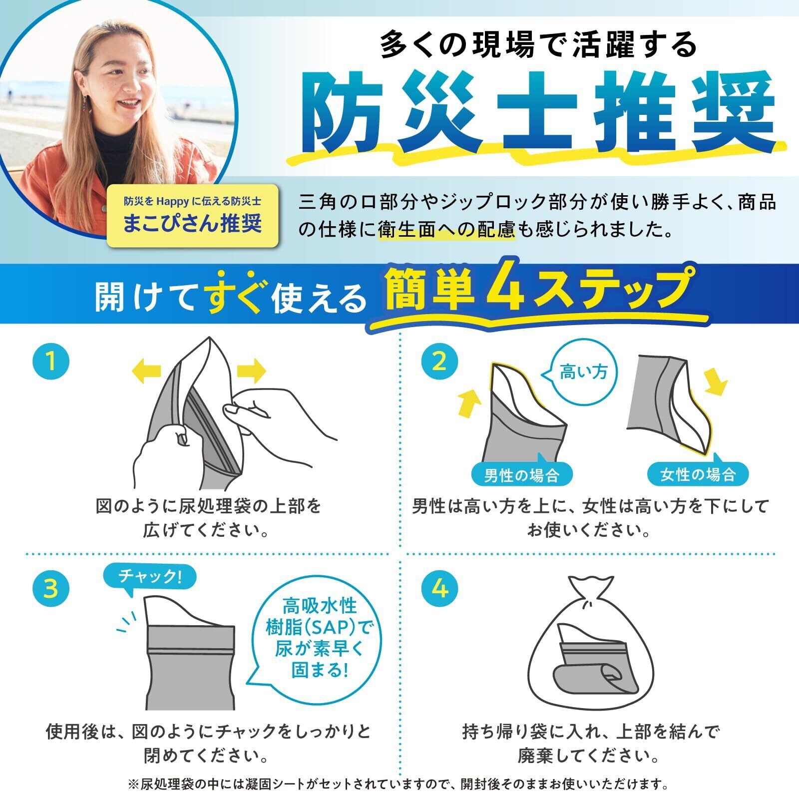 【商品仕様・セット内容】 ●セット内容(1セットにあたる):凝固剤入り尿処理袋、持ち帰り用処理袋、目隠し用プライバシーシート(前掛けタイプ ●最大吸水量:700ml(成人約2回分) ●サイズ(尿処理袋):約13cm×27.5cm ●サイズ(折りたたみ時):約8.5cm×13.5cm(薄型コンパクト) ●素材:ポリエチレン、IXPE、高吸水性樹脂(SAP) ●用途:ドライブ中の渋滞、車中泊、災害・断水時、登山、介護、乗り物酔いのエチケット袋として。 ※各自治体の分別ルールに従って廃棄してください。