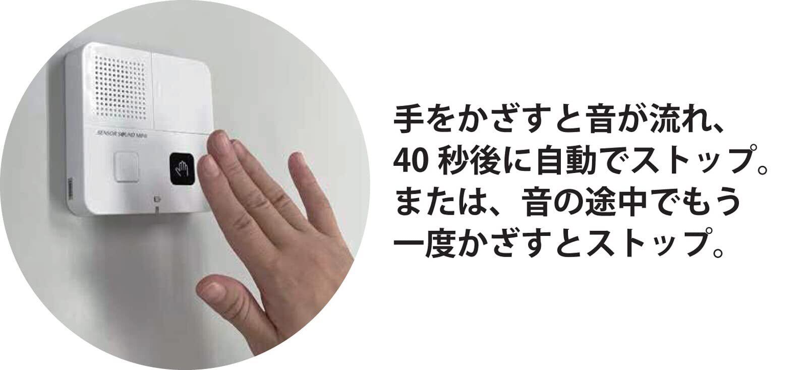 手をかざすと癒し流水音が約40秒間流れ、トイレ使用時の音を消す。 音の途中でもう一度手をかざすと止まる