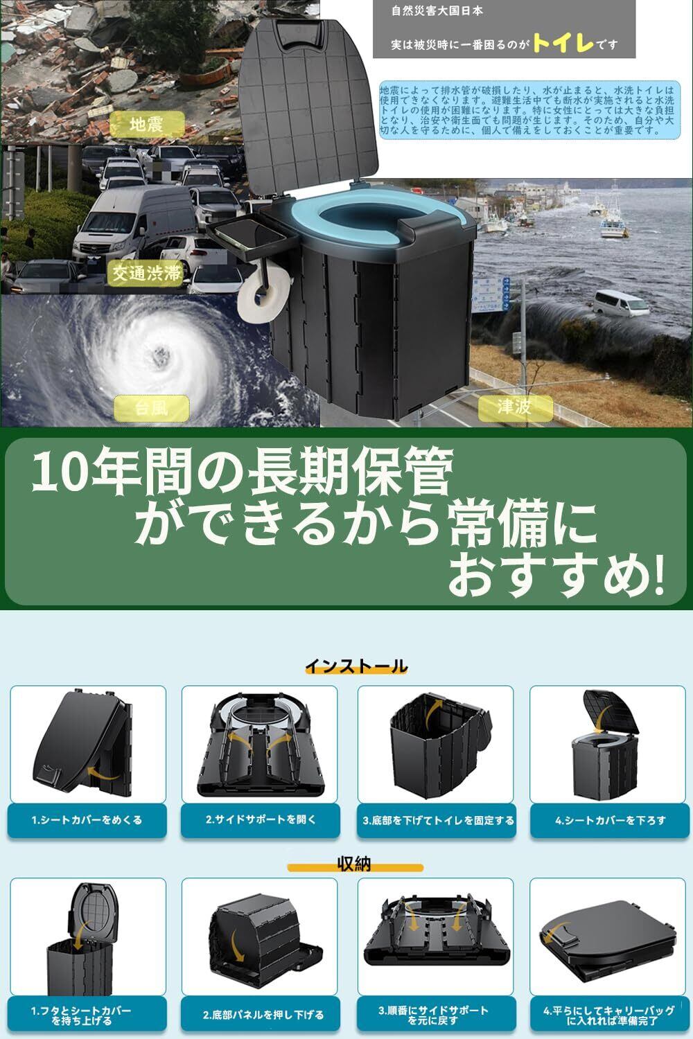 ポータブルトイレ・耐重200KG: この簡易トイレは非常時の避難用としてだけでなく、高速道路の渋滞時やアウトドア活動でも大活躍します。普段はスツールやゴミ箱としても利用可能。最大耐重200KGなので、特に男性におすすめです。