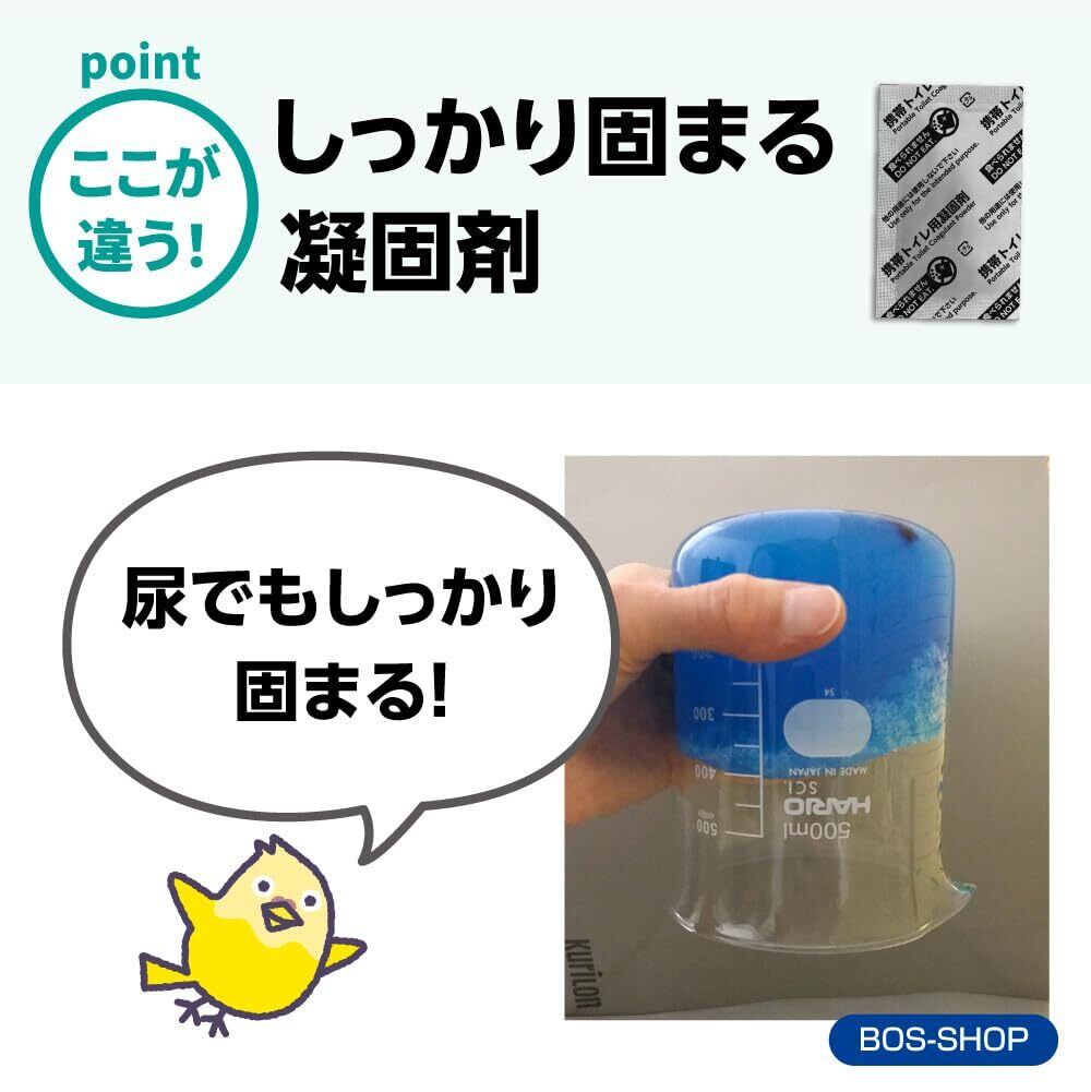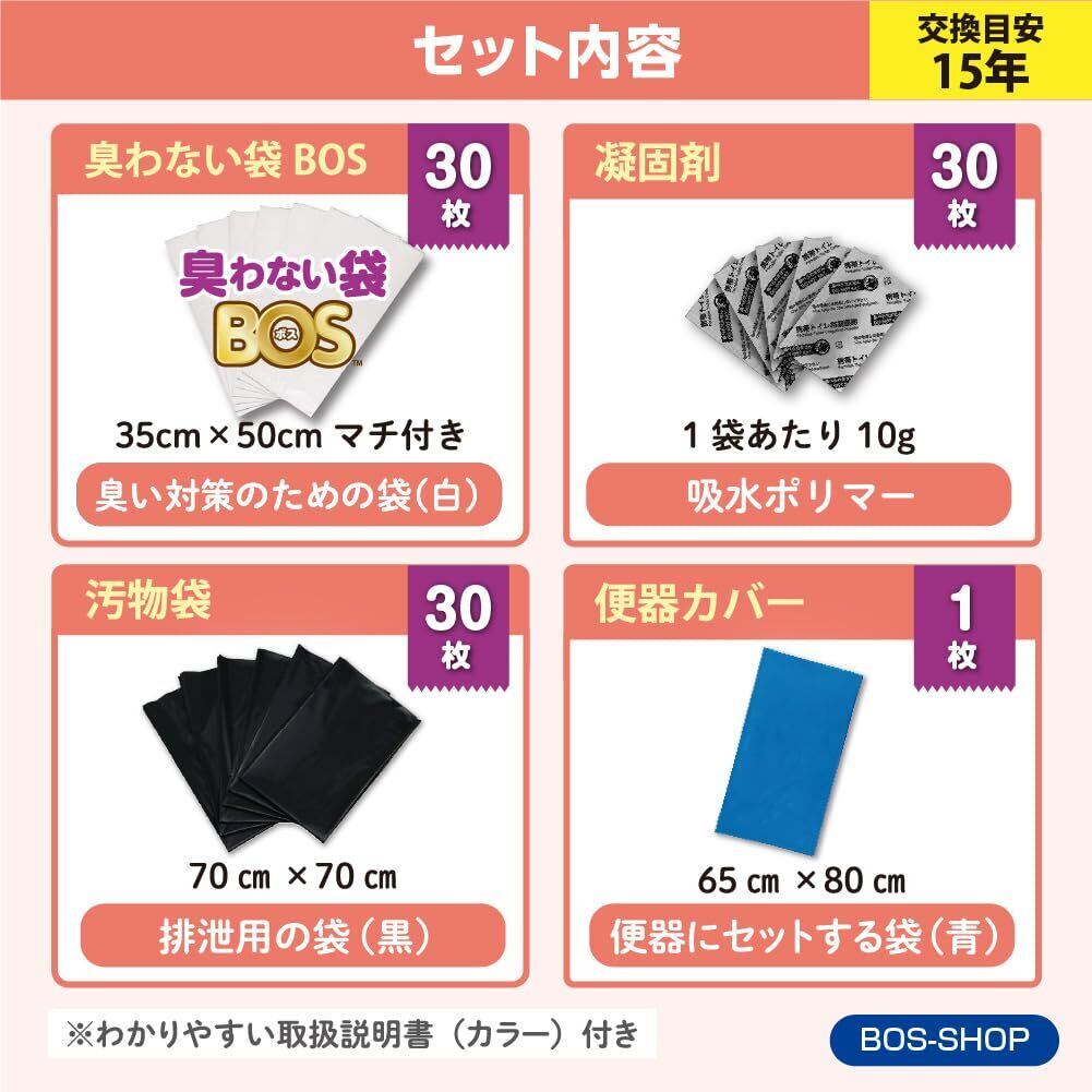 臭わない袋BOS、凝固剤、汚物袋、便器カバーの4点セット+カラーで見やすい取扱説明書付き