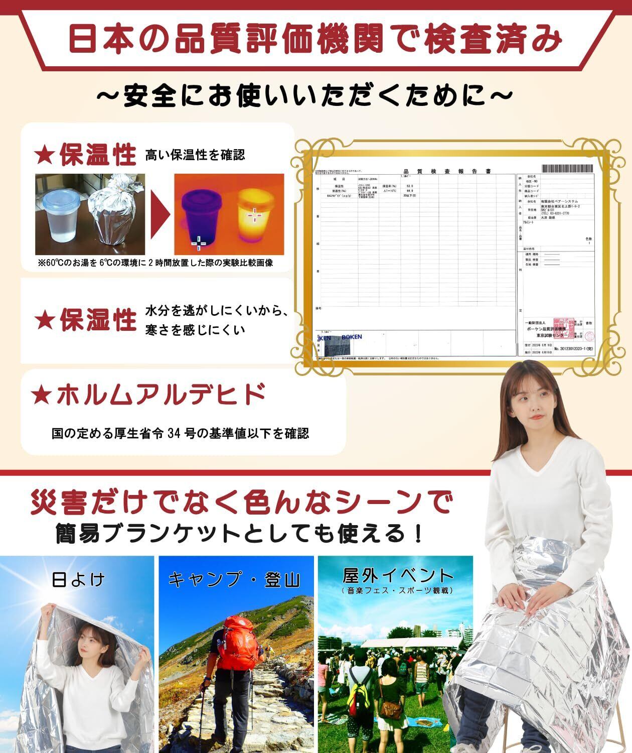 緊急時の暑さ・寒さ対策用の簡易ブランケットとして、災害グッズ、直射日光の日よけ、キャンプ、登山、スポーツ観戦、音楽フェス、食品デリバリー配達の保温シートなどにもご利用いただけます。アルミシート(サバイバルシート)使用後は、水分や汚れ、ほこりを取り除き、付属の収納袋に入れ、乾燥した場所で保管することで、長期間にわたり繰り返し使用することができます。