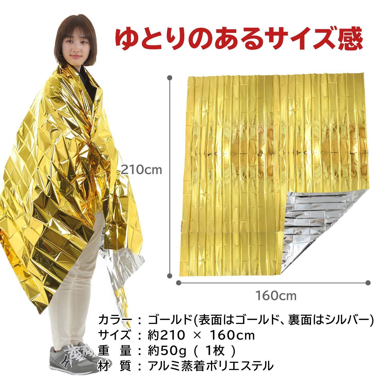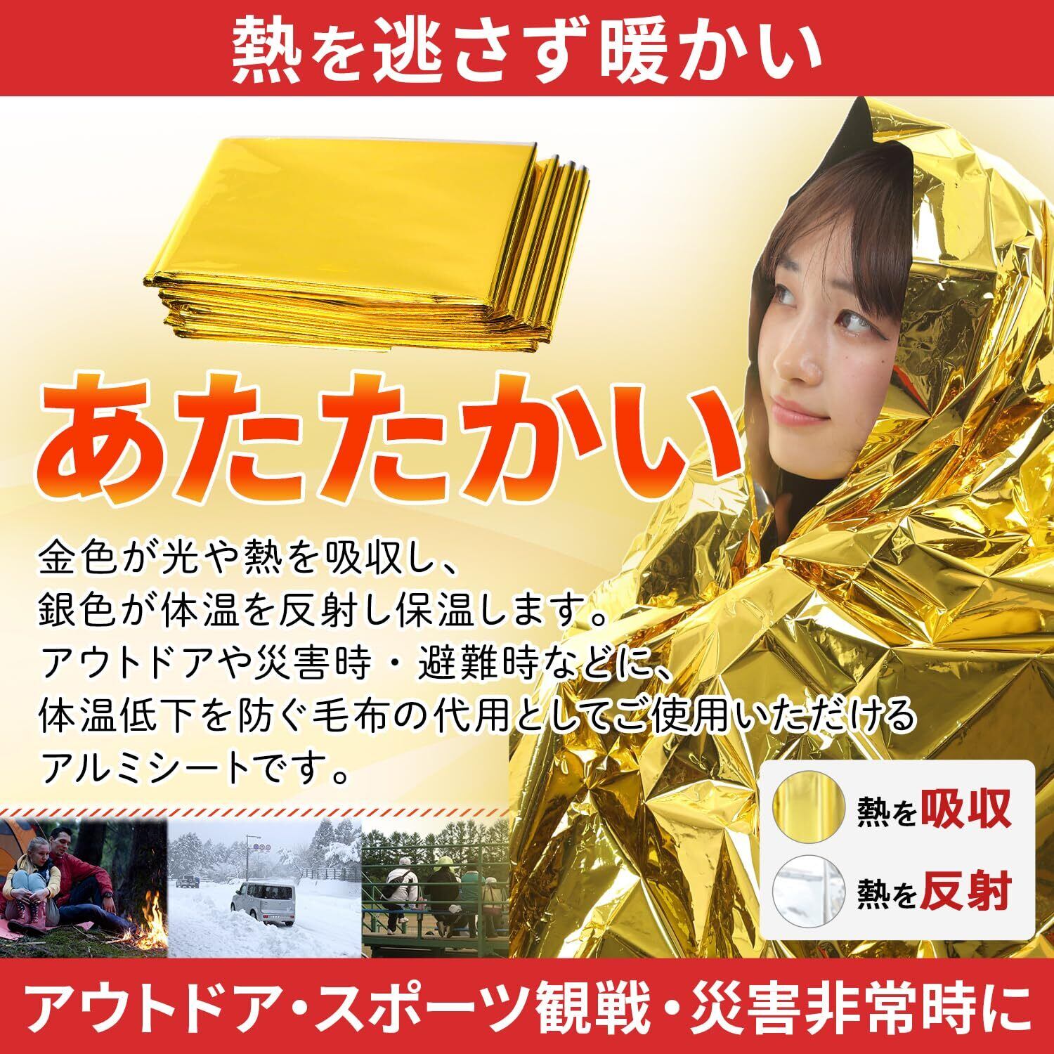 また、リバーシブルで用途が異なり、金色は熱を吸収し、銀色は熱を反射する性質が有ります。 炎天下では銀色側を外側に向けると防暑断熱してくれます。 寒いときは金色を外側に体を包むだけで、体温の放熱を防いでくれます。 緊急時での寒さ対策以外に、登山やスポーツ観戦にも常備しておくと便利です。