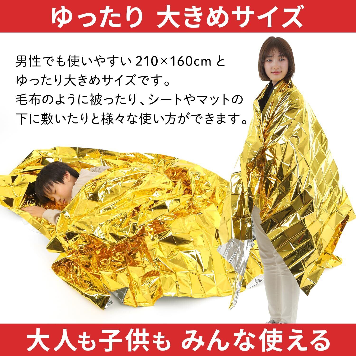 緊急災害時やアウトドアなどに毛布の代用としてご使用いただける、コンパクトなサバイバルシート ( アルミシート )です。 コンパクトに畳まれているため持ち運びやすく、場所を取らないので、カバンや防災リュック、車の中などに常備できます。 広げたサイズは、210 × 160cm で大き目サイズになりますので、大人の男性の方もゆったりご使用いただけ 毛布のように被ったり、シートやマットの下に敷いたりと様々な使い方ができます。防災ガイドを付属しており、非常持出品チェックリストや緊急ダイヤルなど災害への備えについて 必要な情報が提供されています。またコンパクトに収納できるよう専用のポーチを付属しています。