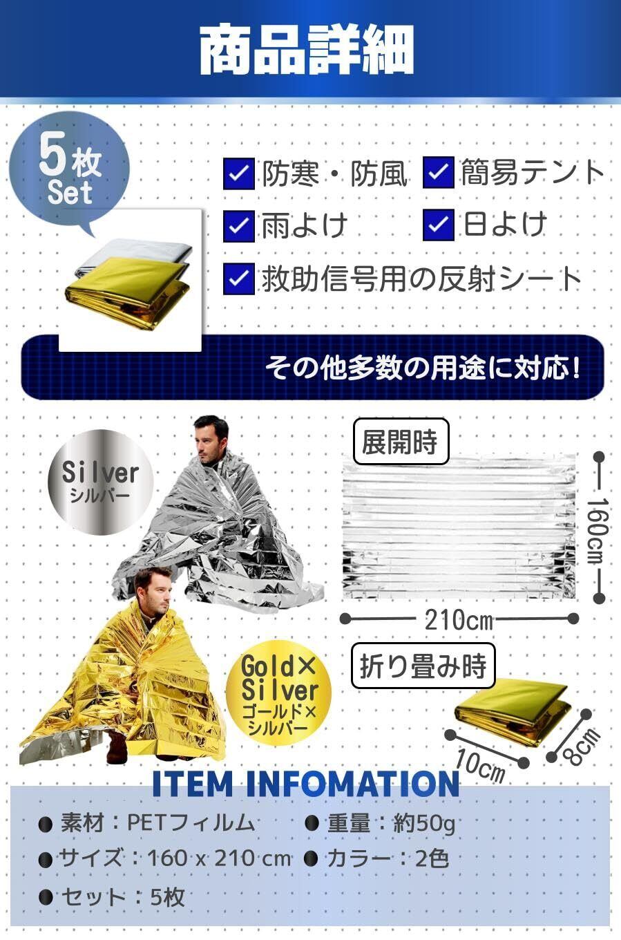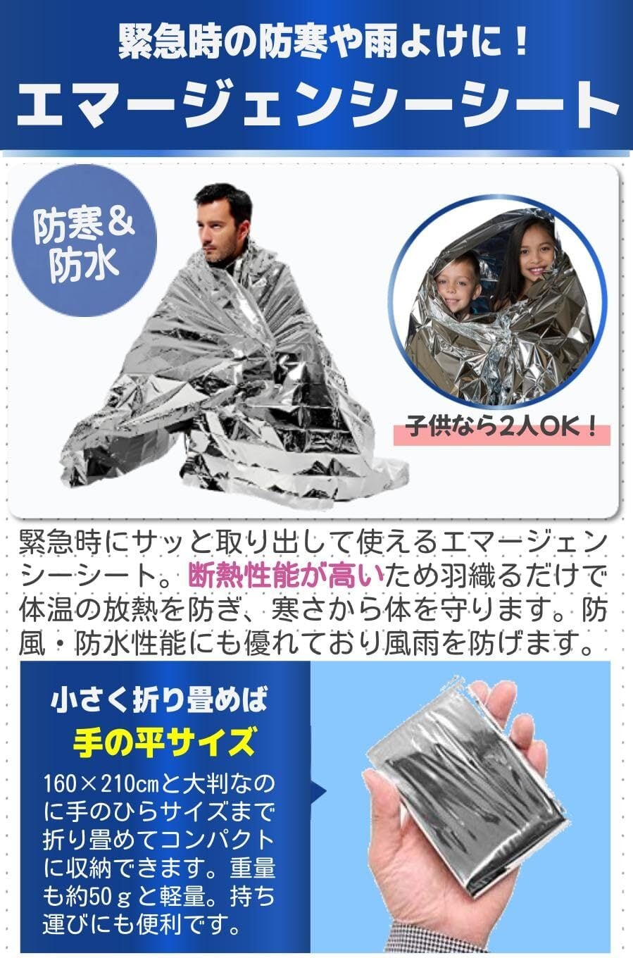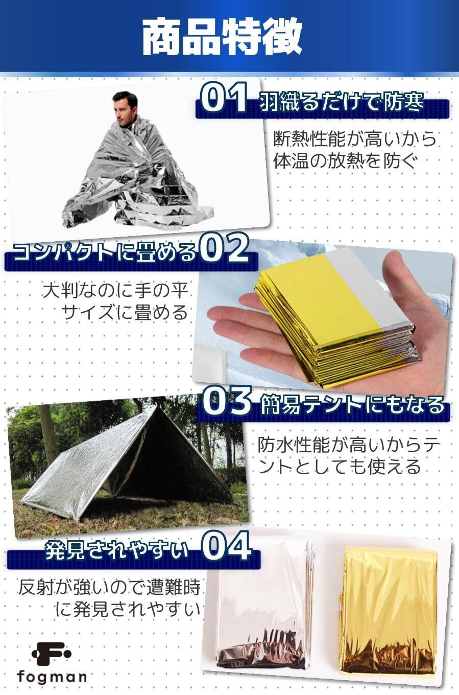 【商品特徴】①羽織るだけで防寒:断熱性能が高いから体温の放熱を防ぐ/②コンパクトに畳める:大判なのに手の平サイズに畳める/③簡易テントにもなる:防水性能が高いからテントとしても使える/④発見されやすい:反射が強いので遭難時に発見されやすい