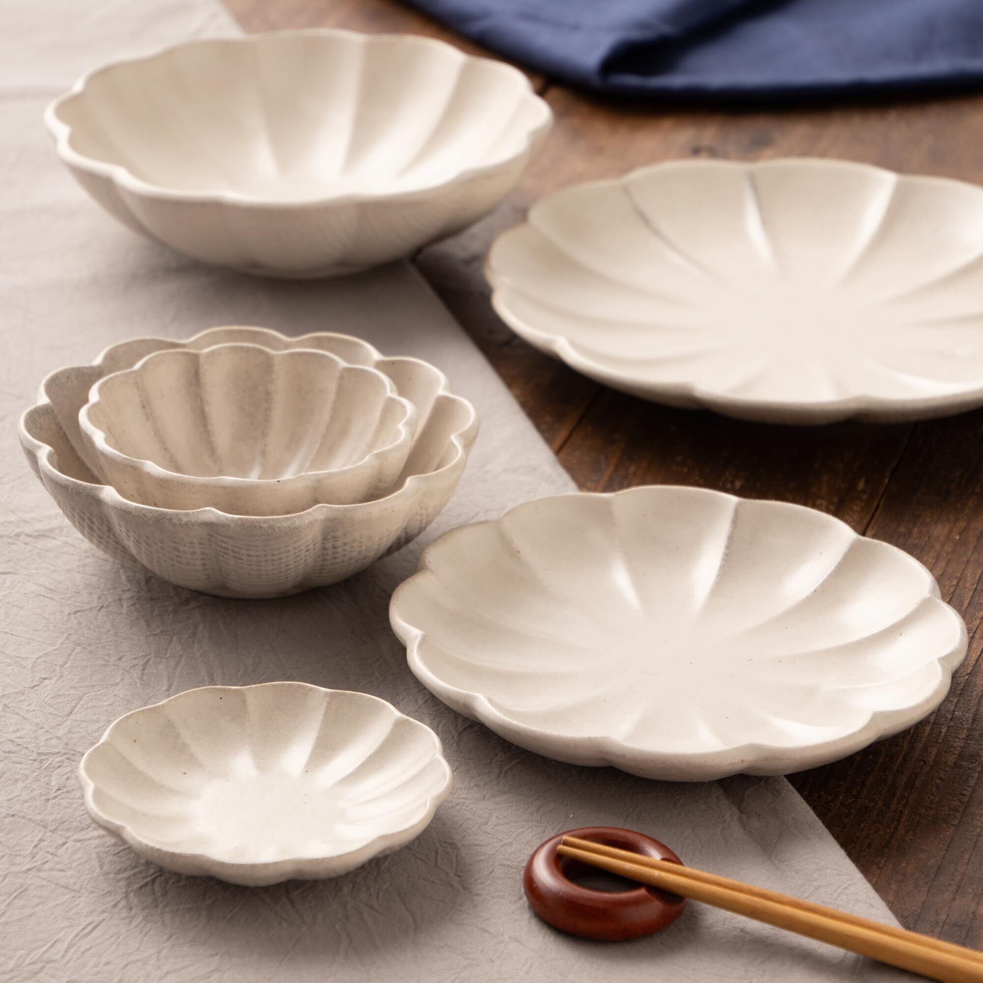 花びらのような形がかわいい布目粉引りんかシリーズ。