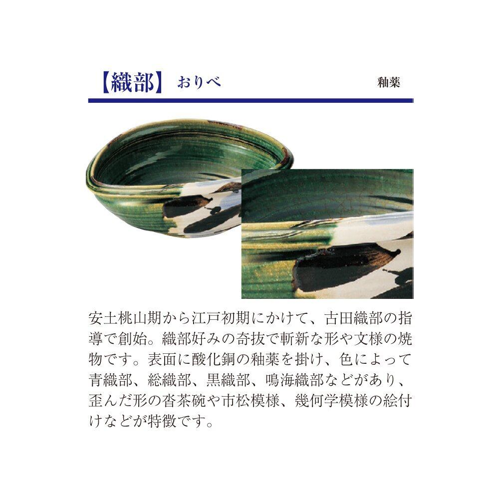 織部(おりべ):安土桃山期から江戸初期にかけて、古田織部の指導で創始。織部好みの奇抜で斬新な形や文様の焼物です。
