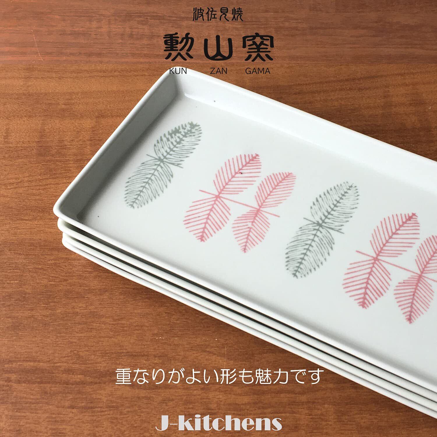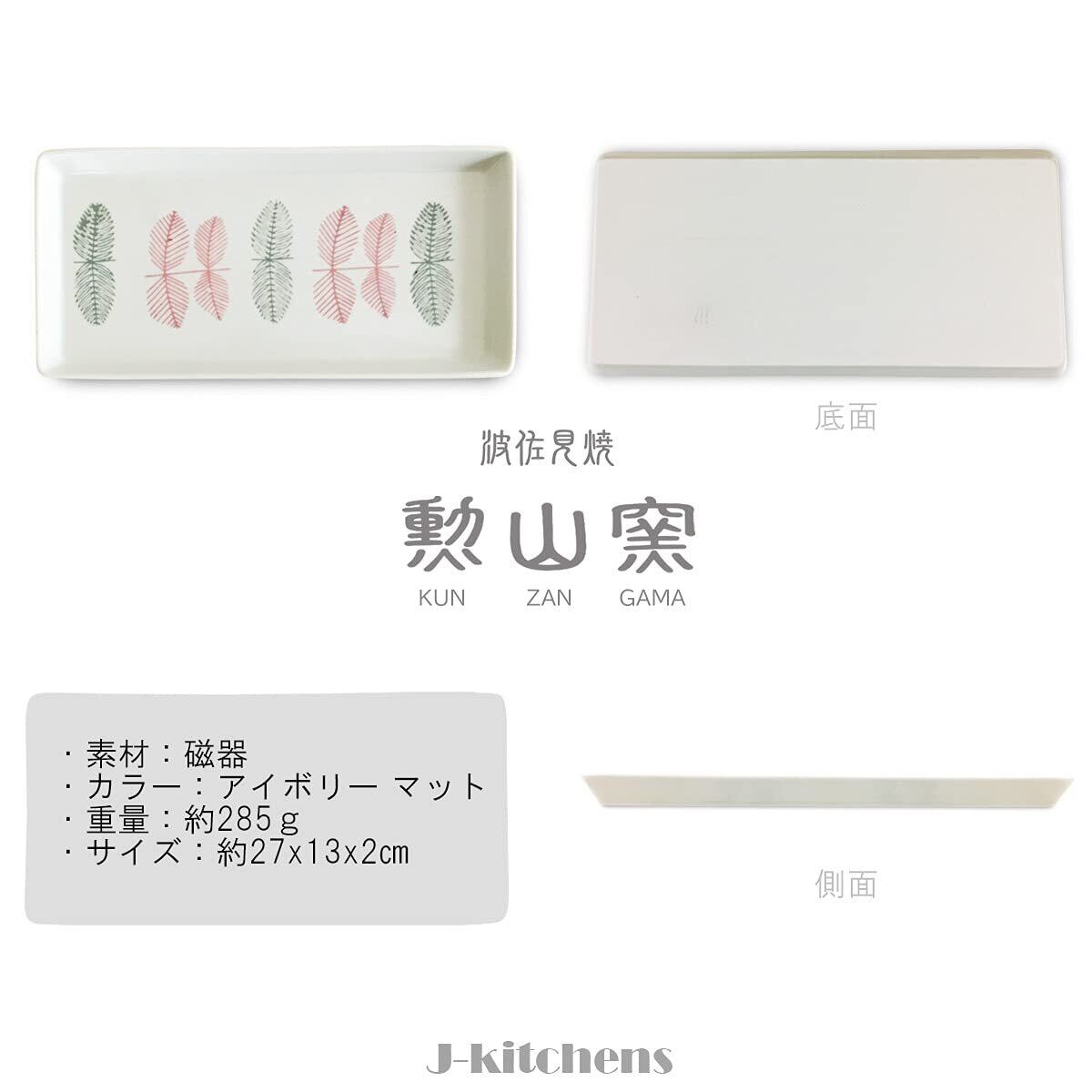 J-kitchens 勲山窯 長角 お皿 波佐見焼 日本製 27x13x2cm 葉紋 レッド