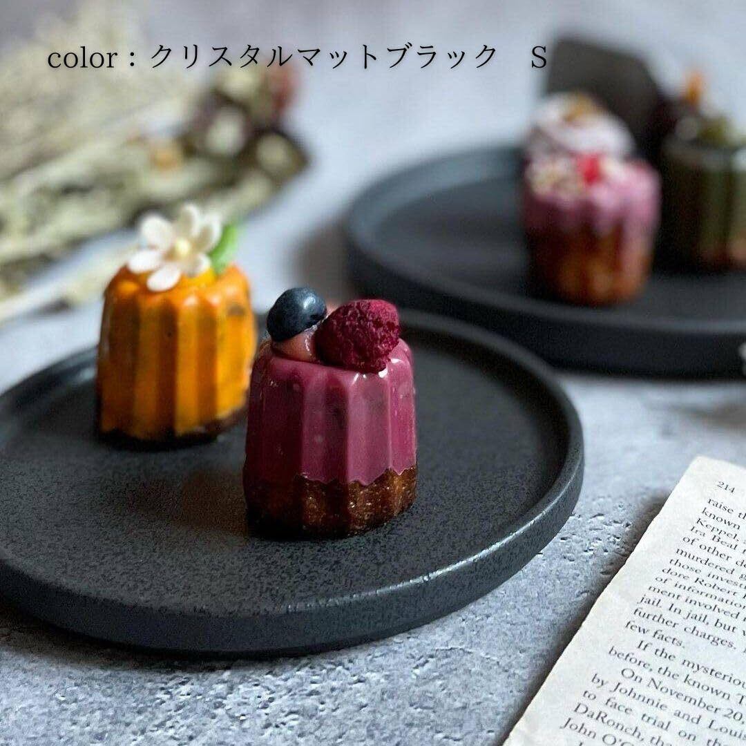 【シンプルで飽きのこないデザイン】クリスタルマットブラックの色合いとシンプルな形状が特徴のフラットプレートです。食材を美味しく魅せるために作られているのでお料理を最大限に引き立てます。小さなサイズ感もあり、取り皿やスイーツ皿として大活躍します。