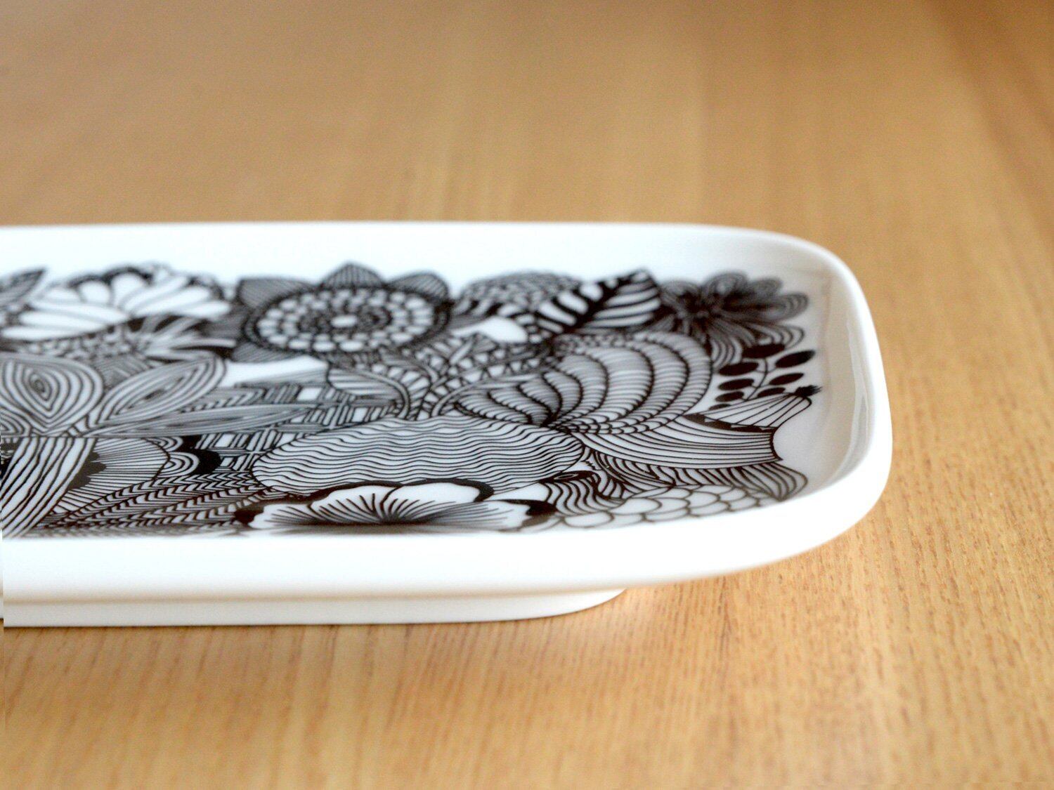 ボタニカルなモチーフをエネルギッシュに描いた、Siirtolapuutarha柄のスクエアプレートです。