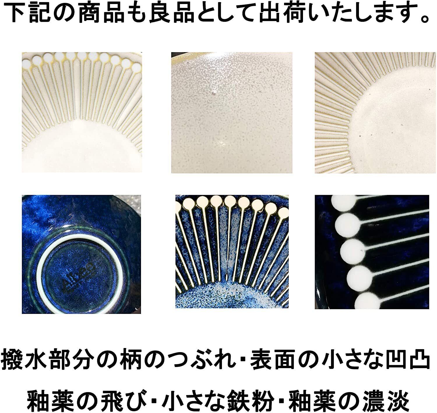 同じ土、技法、釉薬を使用しても、焼成時の窯での火の当たり加減、その日の天候や湿度などの影響によって色合いが常に変化するため、焼き物は生き物だといわれます。窯変による色の濃淡や、撥水で描かれる柄の出具合などには個体差があり、釉薬の滲みやたれ、ハゲ、ゆがみ、鉄粉やピンホールなどが見られる場合もございますが、器の持つ個性や味わい深さとしてご理解いただき、一つ一つ異なる器との出会いをお楽しみいただけましたら幸いです。