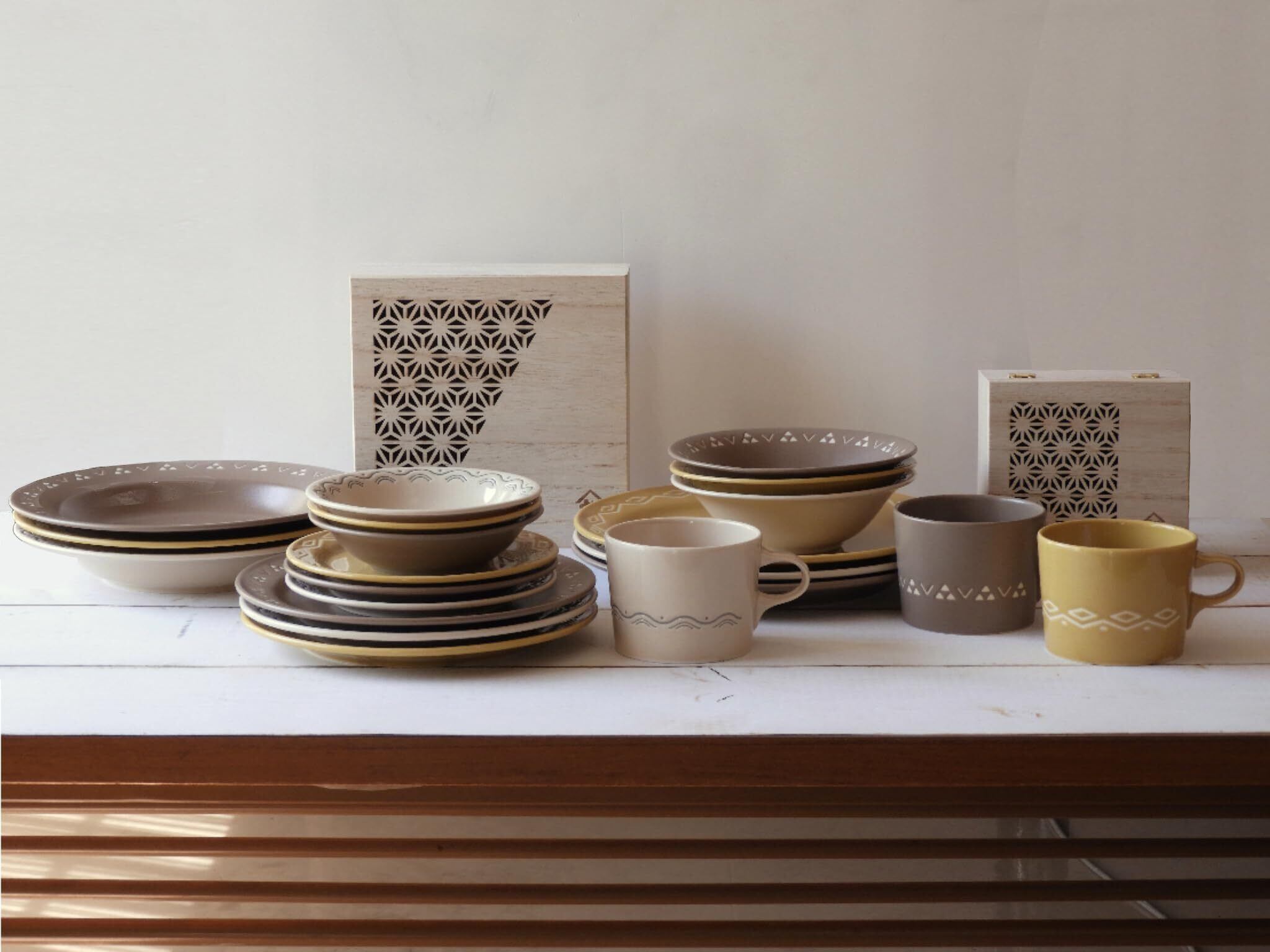 「 komon 」は、3種類の和柄(青海波、菱紋、鱗紋)を食器として使いやすいようにアレンジしたテーブルウェアのシリーズ。