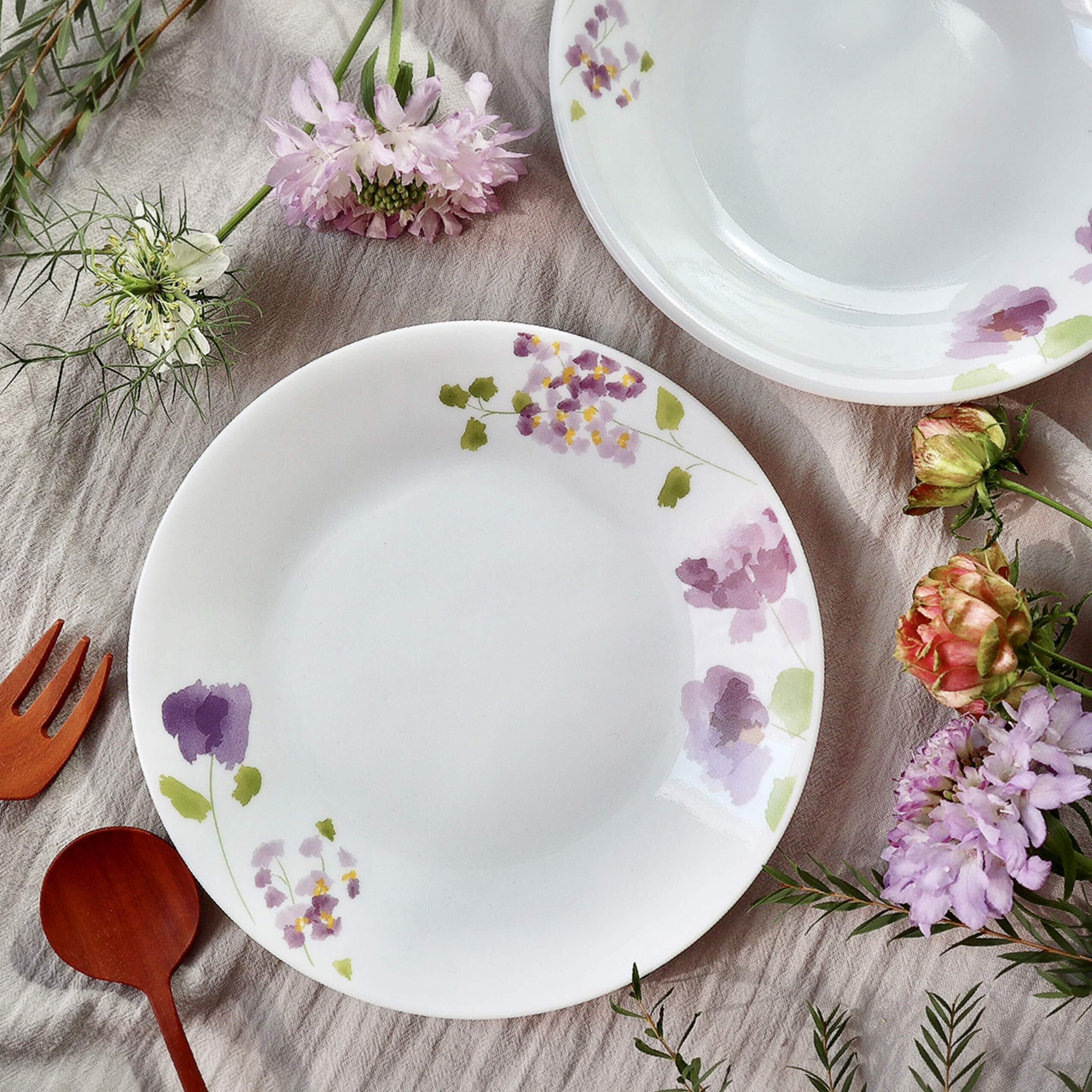 水彩で描かれた紫やピンクの花模様が特徴のコレール「バイオレットミスト」シリーズ。