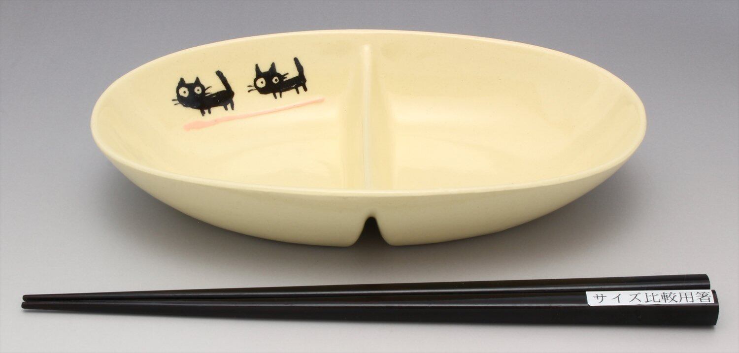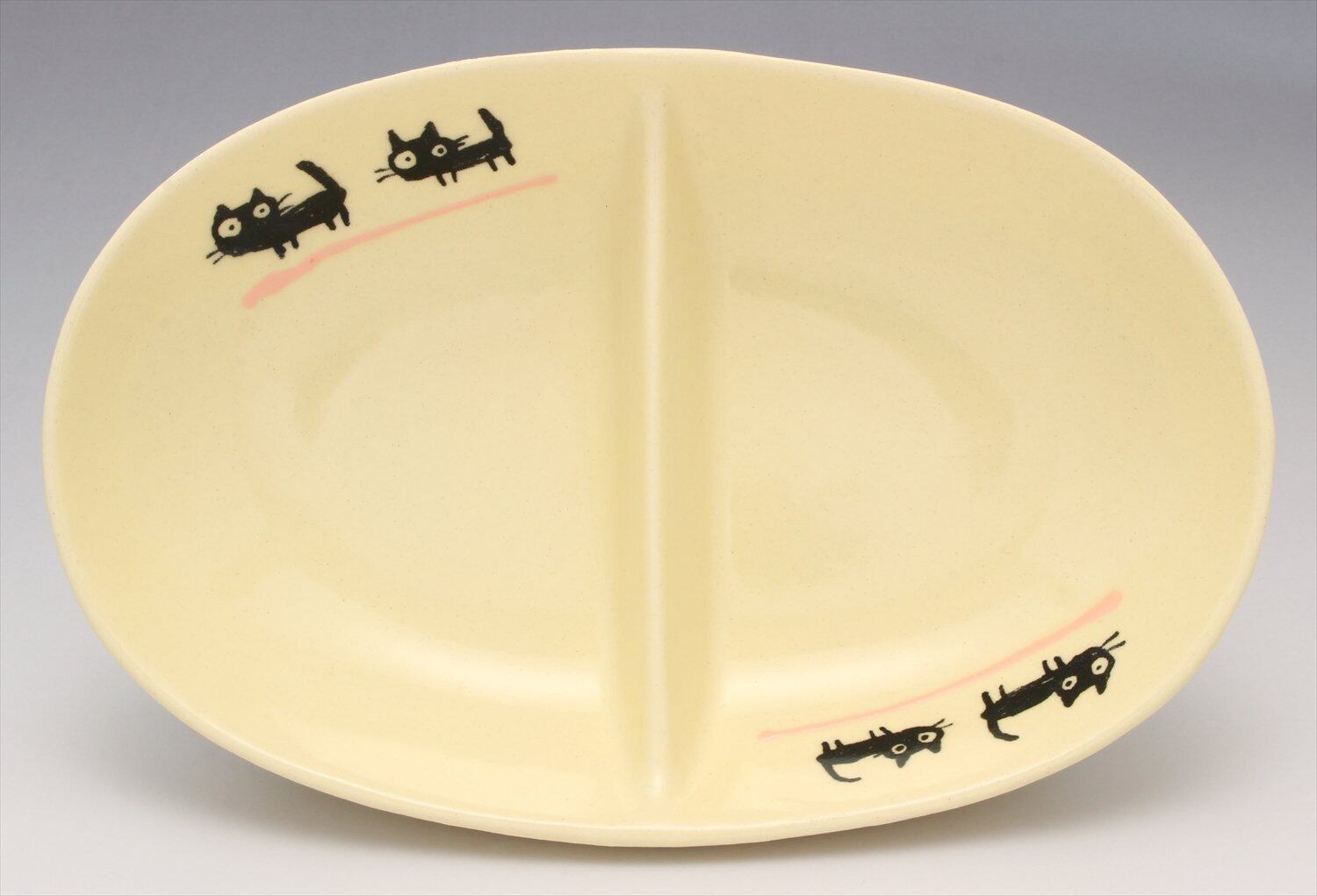 窯元SOUSEN 中皿 ピンク 18cm 瀬戸焼 二つ仕切り皿 黒ネコ柄