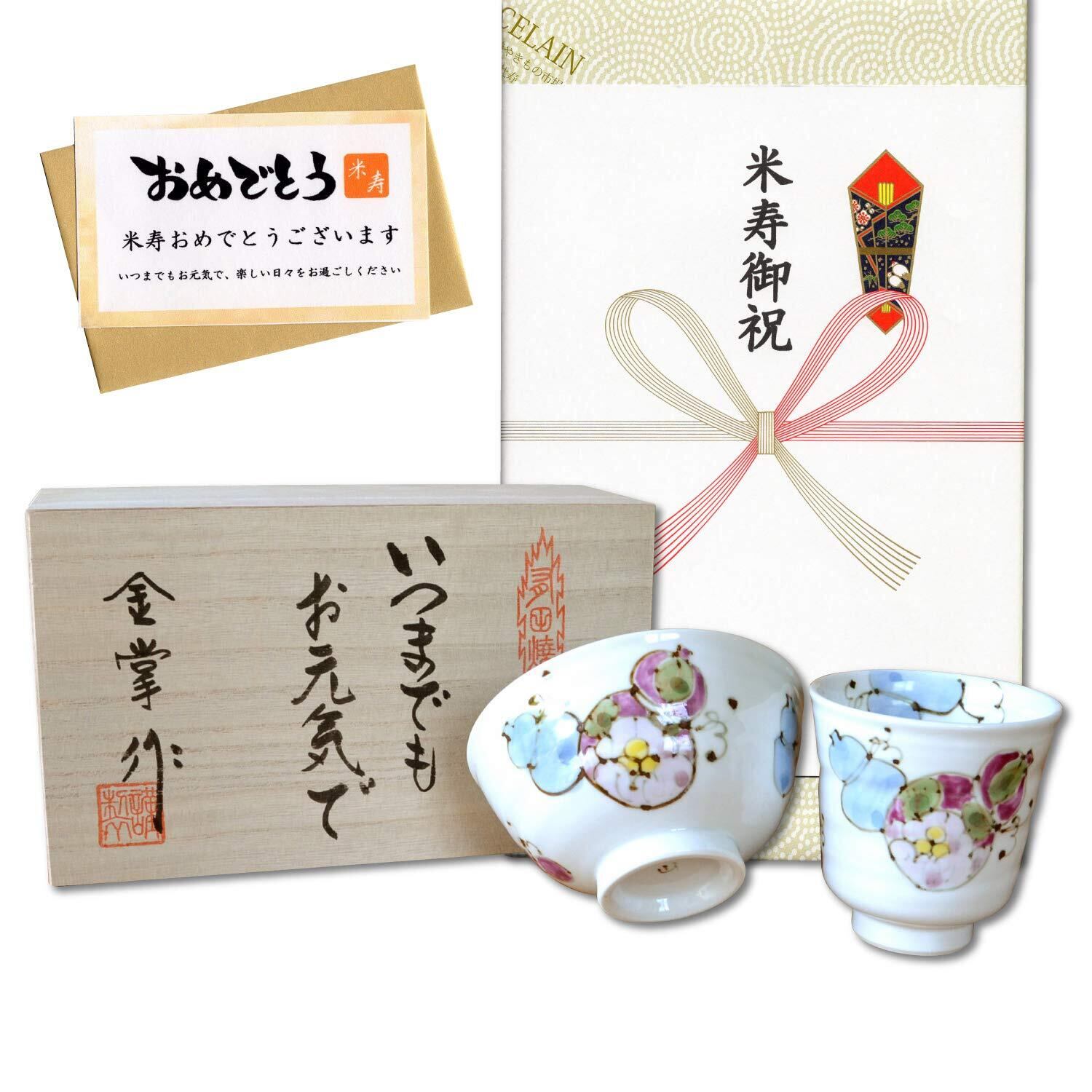 【特価セール】米寿祝い 無病息災を願った縁起物ギフト 有田焼 湯呑み 茶碗 飯碗 セット のし・メッセージカード付き 木箱入り 花六瓢 青