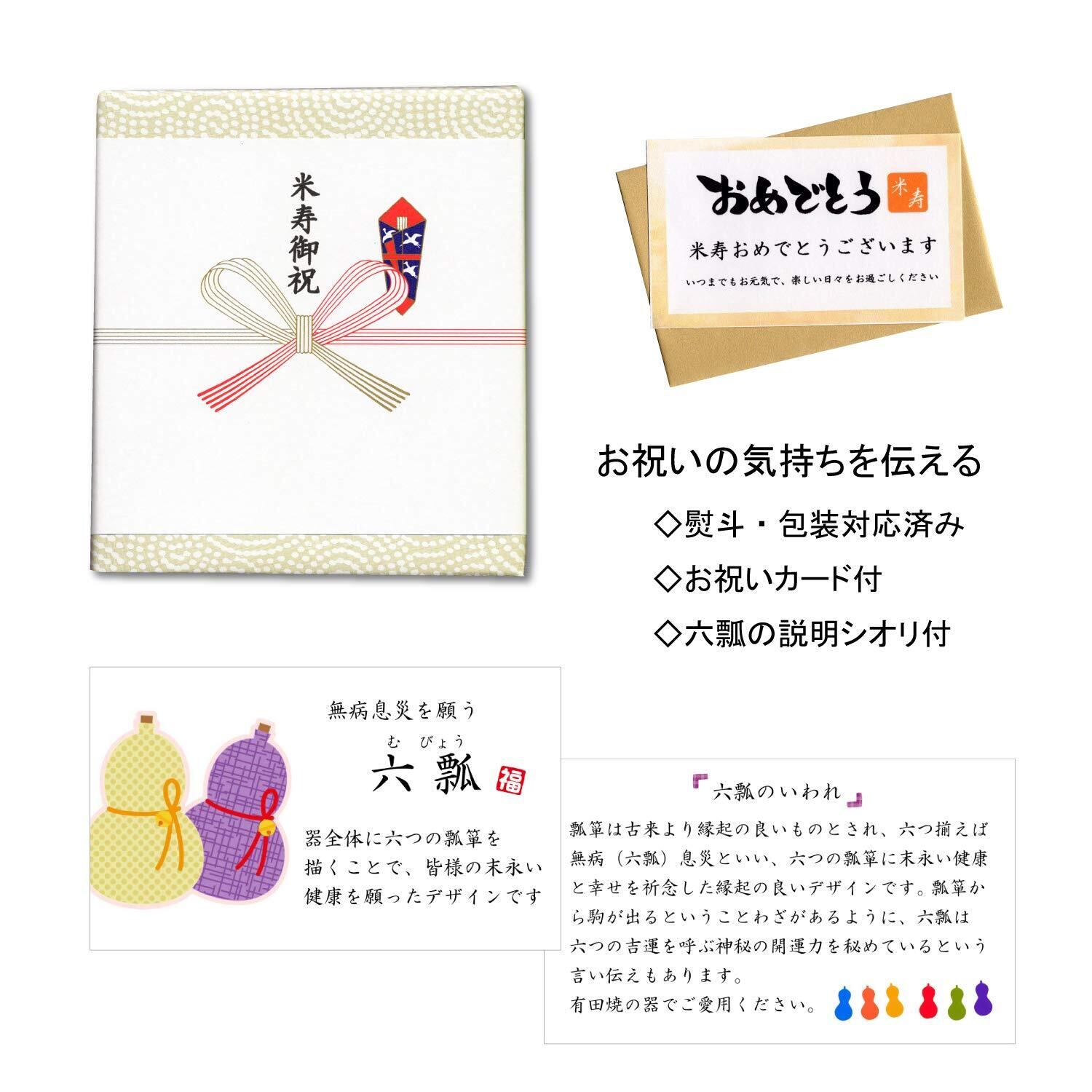 米寿祝い 無病息災を願った縁起物ギフト 有田焼 湯呑み 茶碗 飯碗 セット のし・メッセージカード付き 木箱入り 鍋島六瓢 青