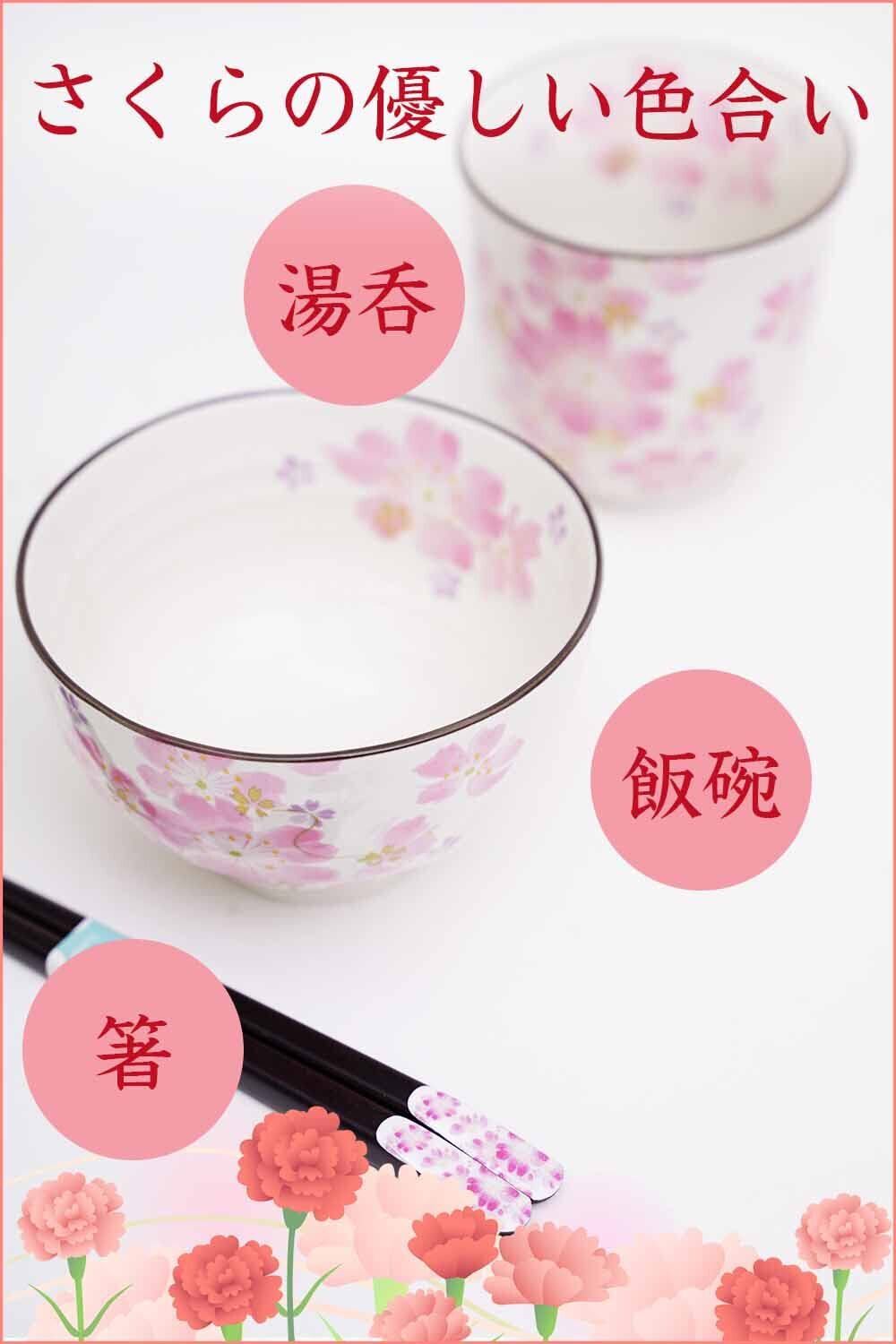 淡い色で上品に仕上げた桜柄の飯碗湯呑&同柄の若狭塗り天宝箸(日本製)のセットです。
