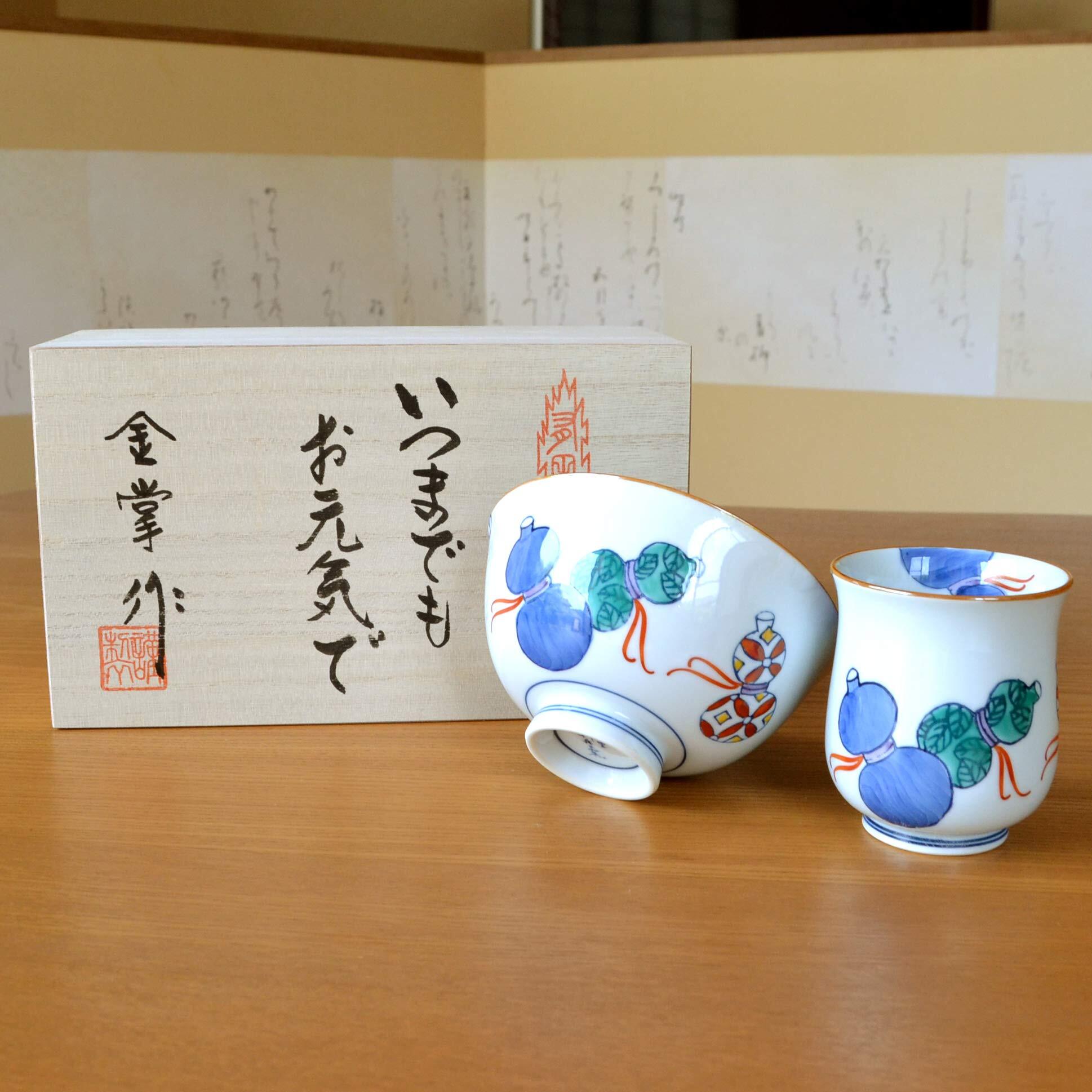 傘寿祝い 湯呑み 茶碗 飯碗 セット 無病息災を願った縁起物ギフト 有田焼 のし・メッセージカード付き 木箱入り 鍋島六瓢 青