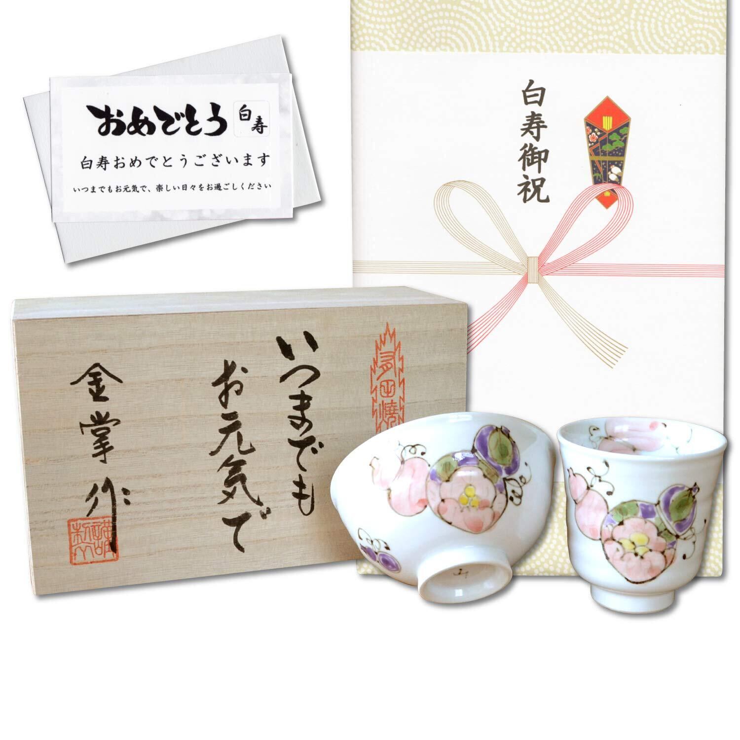 白寿お祝い 99歳 無病息災を願った縁起物ギフト 有田焼 湯呑み 茶碗 飯碗 セット 花六瓢 赤 白寿熨斗・メッセージカード付き 木箱入り